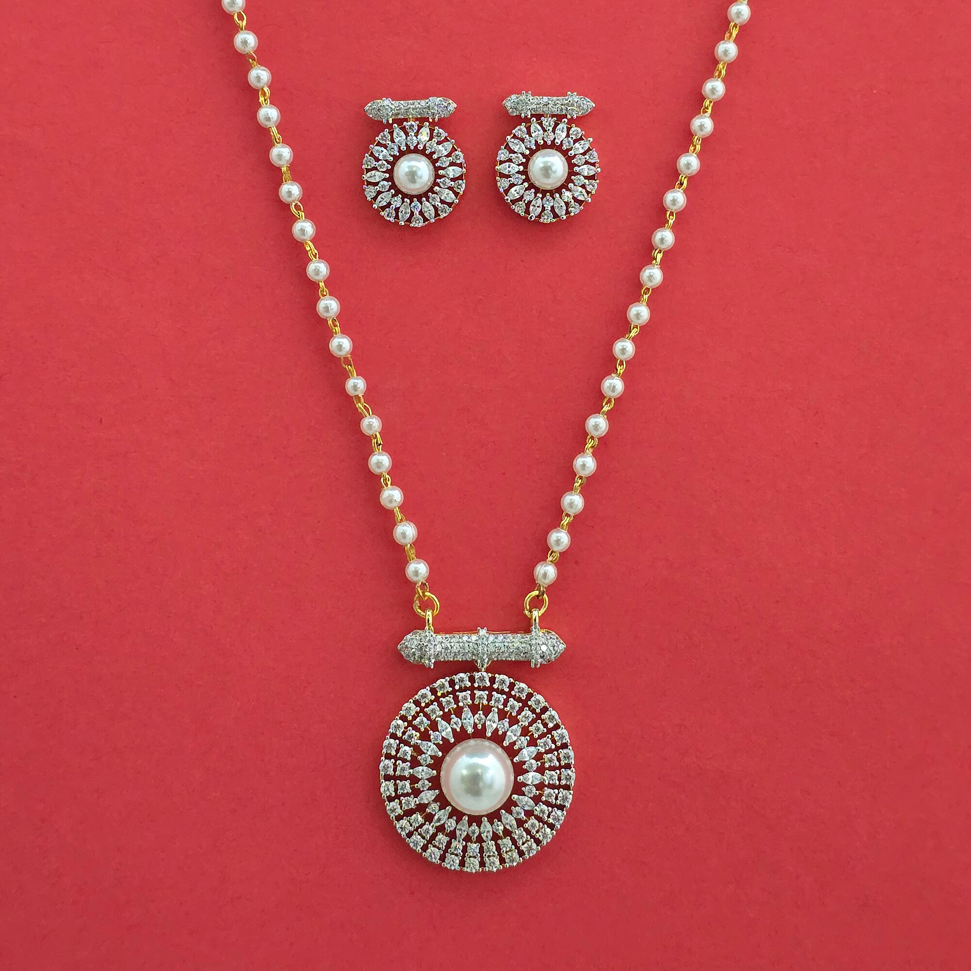 Kanhai Jewels offers an exclusive collection of finest quality crafted Fashion Jewellery in various colors. We make sure that our collection of American Diamond Moti Pendant Set With 2 Tone Plating are beautiful, elegant & will surely galvanize you, because our products are unique, comfortable, fashion forward & very popular for the rich look. Base Metal of our product is Alloy, i.e mixing of Copper & Brass. We pack all the products using quality packaging material to ensure safe and secure transportation.