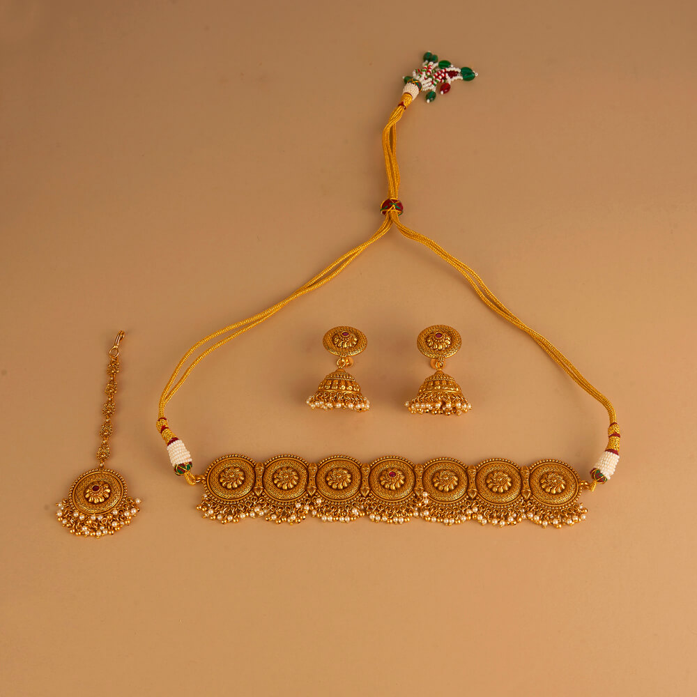 Kanhai Jewels Offers An Exclusive Collection Of Finest Quality Crafted Fashion Jewellery In Various Colors. We Make Sure That Our Collection Of Antique Choker Necklace Set With Matte Gold Plating Are Beautiful, Elegent & Will Surely Galvanize You, Because Our Products Are Unique, Comfortable, Fashion Forward & Very Popular For The Rich Look. Base Metal Of Our Product Is Alloy, I.E Mixing Of Copper & Brass. We Pack All The Products Using Quality Packaging Material To Ensure Safe And Secure Transportation.