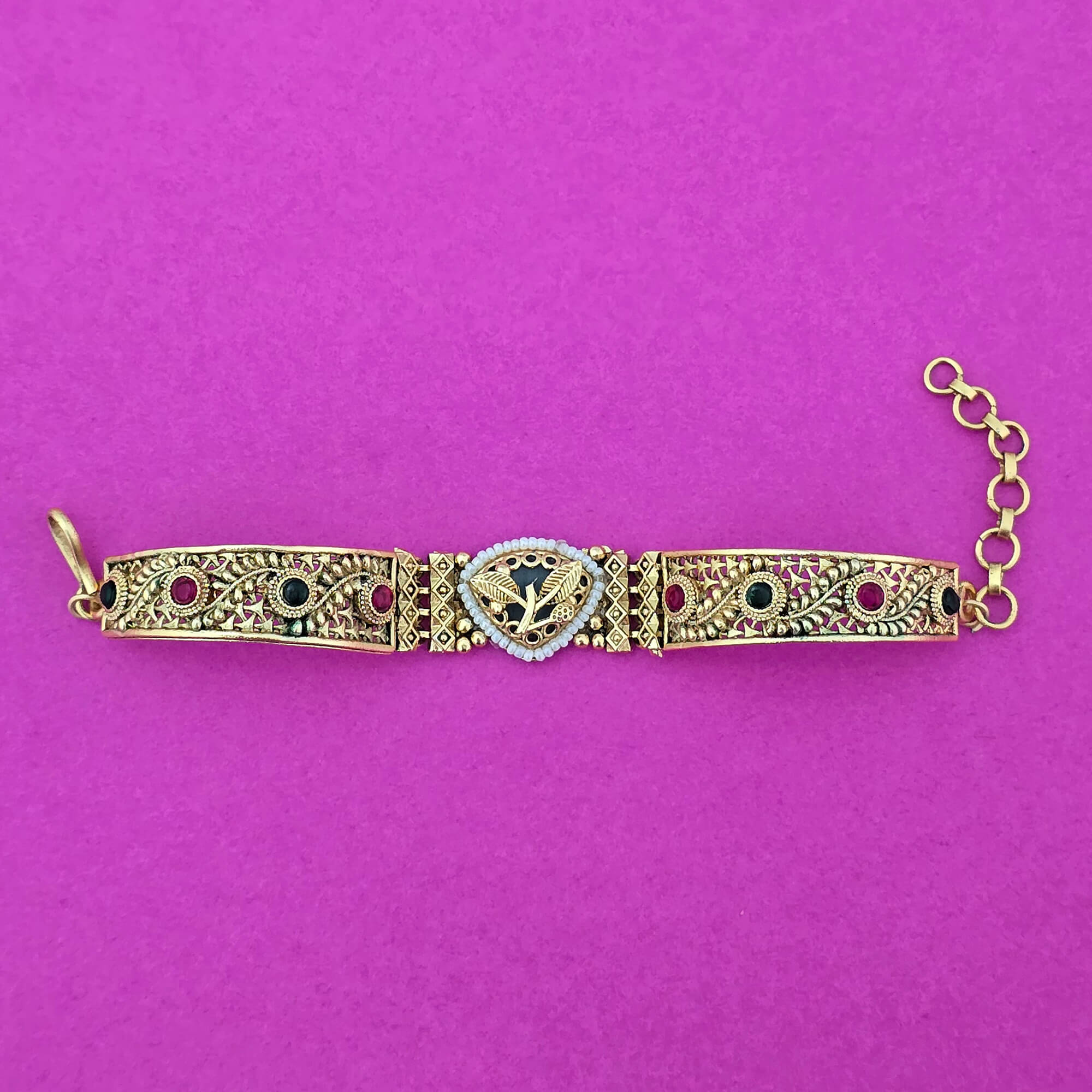 Kanhai Jewels offers an exclusive collection of finest quality crafted Fashion Jewellery in various colors. We make sure that our collection of Antique Classic Bracelet With Matte Gold Plating are beautiful, elegent & will surely galvanize you, because our products are unique, comfortable, fashion forward & very popular for the rich look. Base Metal of our product is Alloy, i.e Mixing of Copper & Brass. We pack all the products using quality packaging material to ensure safe and secure transportation.