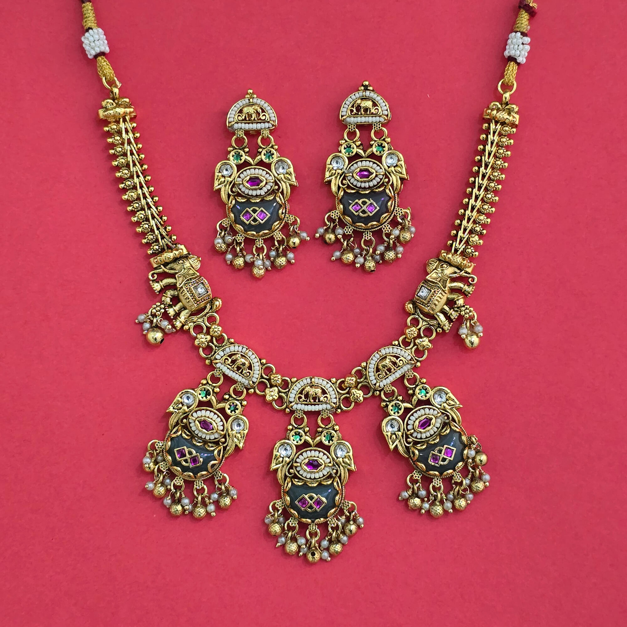 Kanhai Jewels offers an exclusive collection of finest quality crafted Fashion Jewellery in various colors. We make sure that our collection of Antique Classic Necklace Set With Gold Plating are beautiful, elegent & will surely galvanize you, because our products are unique, comfortable, fashion forward & very popular for the rich look. Base Metal of our product is Alloy, i.e Mixing of Copper & Brass. We pack all the products using quality packaging material to ensure safe and secure transportation.