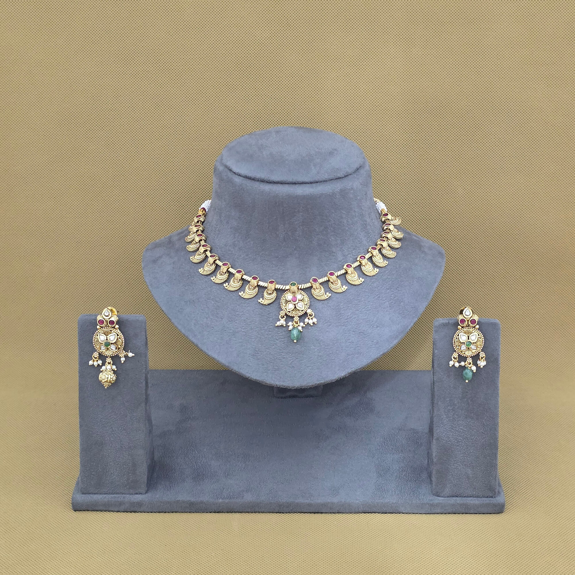 Kanhai Jewels offers an exclusive collection of finest quality crafted Fashion Jewellery in various colors. We make sure that our collection of Antique Classic Necklace Set With Matte Gold Plating are beautiful, elegent & will surely galvanize you, because our products are unique, comfortable, fashion forward & very popular for the rich look. Base Metal of our product is Alloy, i.e Mixing of Copper & Brass. We pack all the products using quality packaging material to ensure safe and secure transportation.
