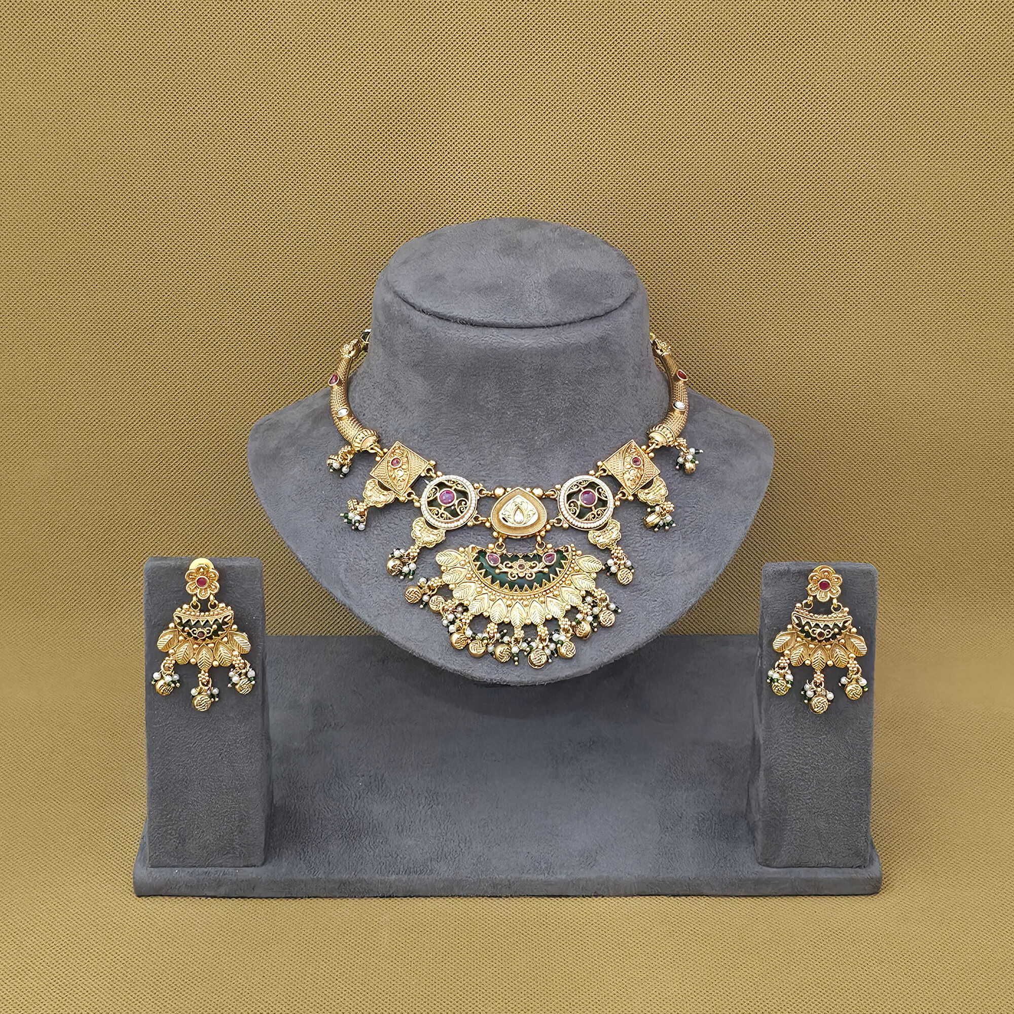 Kanhai Jewels offers an exclusive collection of finest quality crafted Fashion Jewellery in various colors. We make sure that our collection of Antique Classic Necklace Set With Matte Gold Plating are beautiful, elegent & will surely galvanize you, because our products are unique, comfortable, fashion forward & very popular for the rich look. Base Metal of our product is Alloy, i.e Mixing of Copper & Brass. We pack all the products using quality packaging material to ensure safe and secure transportation.