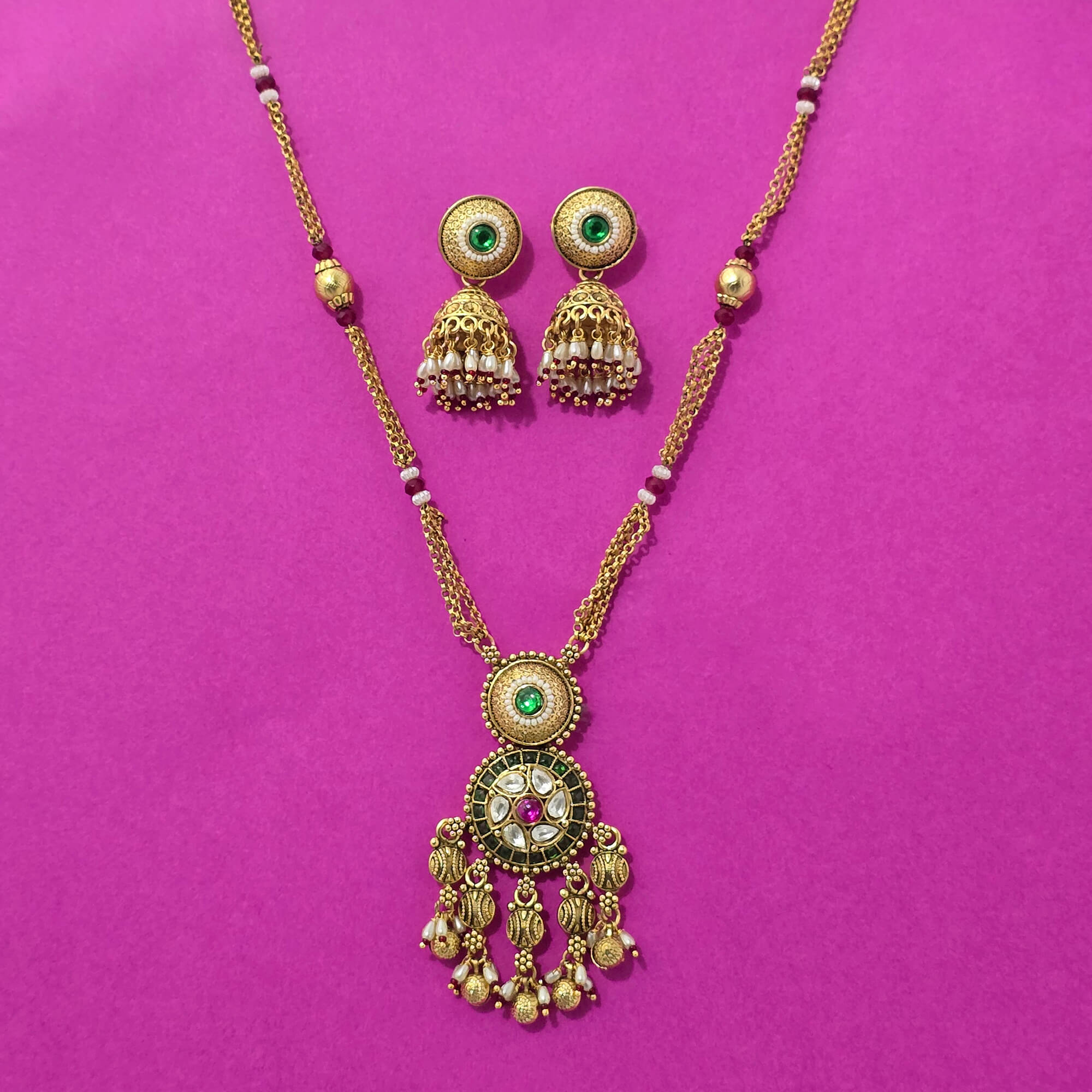Kanhai Jewels offers an exclusive collection of finest quality crafted Fashion Jewellery in various colors. We make sure that our collection of Antique Classic Pendant Set With Matte Gold Plating are beautiful, elegent & will surely galvanize you, because our products are unique, comfortable, fashion forward & very popular for the rich look. Base Metal of our product is Alloy, i.e Mixing of Copper & Brass. We pack all the products using quality packaging material to ensure safe and secure transportation.