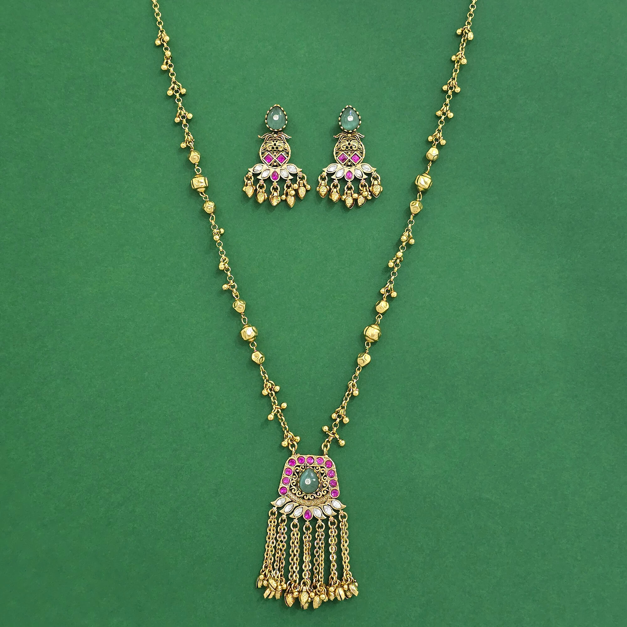 Kanhai Jewels offers an exclusive collection of finest quality crafted Fashion Jewellery in various colors. We make sure that our collection of Antique Classic Pendant Set With Matte Gold Plating are beautiful, elegent & will surely galvanize you, because our products are unique, comfortable, fashion forward & very popular for the rich look. Base Metal of our product is Alloy, i.e Mixing of Copper & Brass. We pack all the products using quality packaging material to ensure safe and secure transportation.
