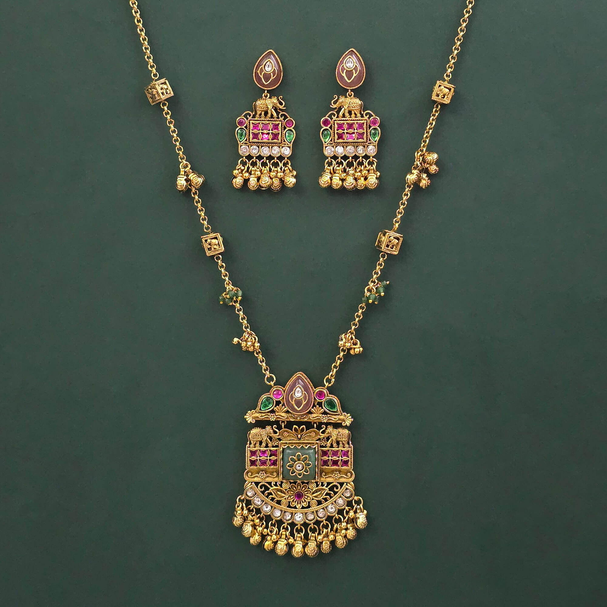 Kanhai Jewels offers an exclusive collection of finest quality crafted Fashion Jewellery in various colors. We make sure that our collection of Antique Classic Pendant Set With Matte Gold Plating are beautiful, elegant & will surely galvanize you, because our products are unique, comfortable, fashion forward & very popular for the rich look. Base Metal of our product is Alloy, i.e mixing of Copper & Brass. We pack all the products using quality packaging material to ensure safe and secure transportation.