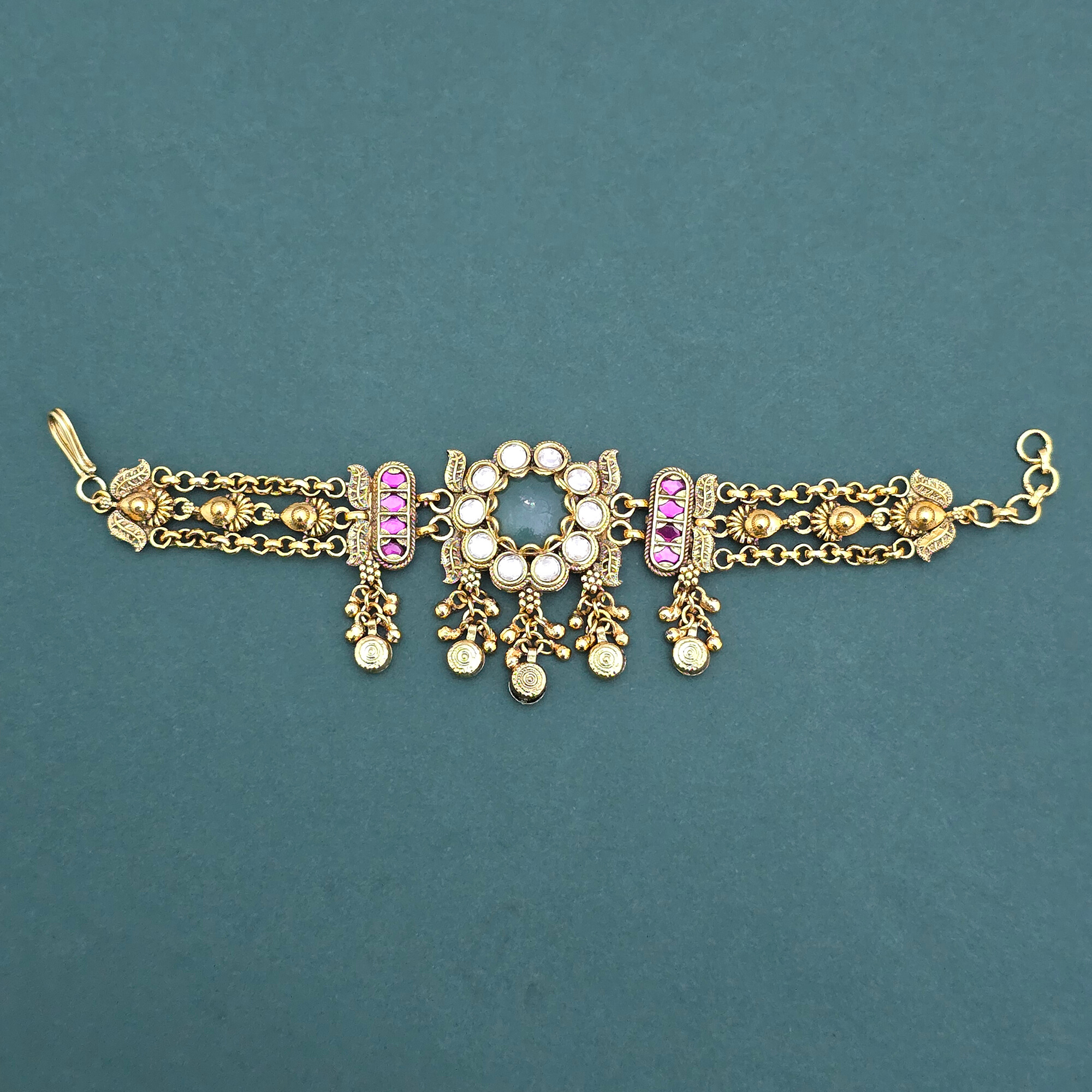 Kanhai Jewels offers an exclusive collection of finest quality crafted Fashion Jewellery in various colors. We make sure that our collection of Antique Heritage Bracelet With Matte Gold Plating are beautiful, elegent & will surely galvanize you, because our products are unique, comfortable, fashion forward & very popular for the rich look. Base Metal of our product is Alloy, i.e Mixing of Copper & Brass. We pack all the products using quality packaging material to ensure safe and secure transportation.