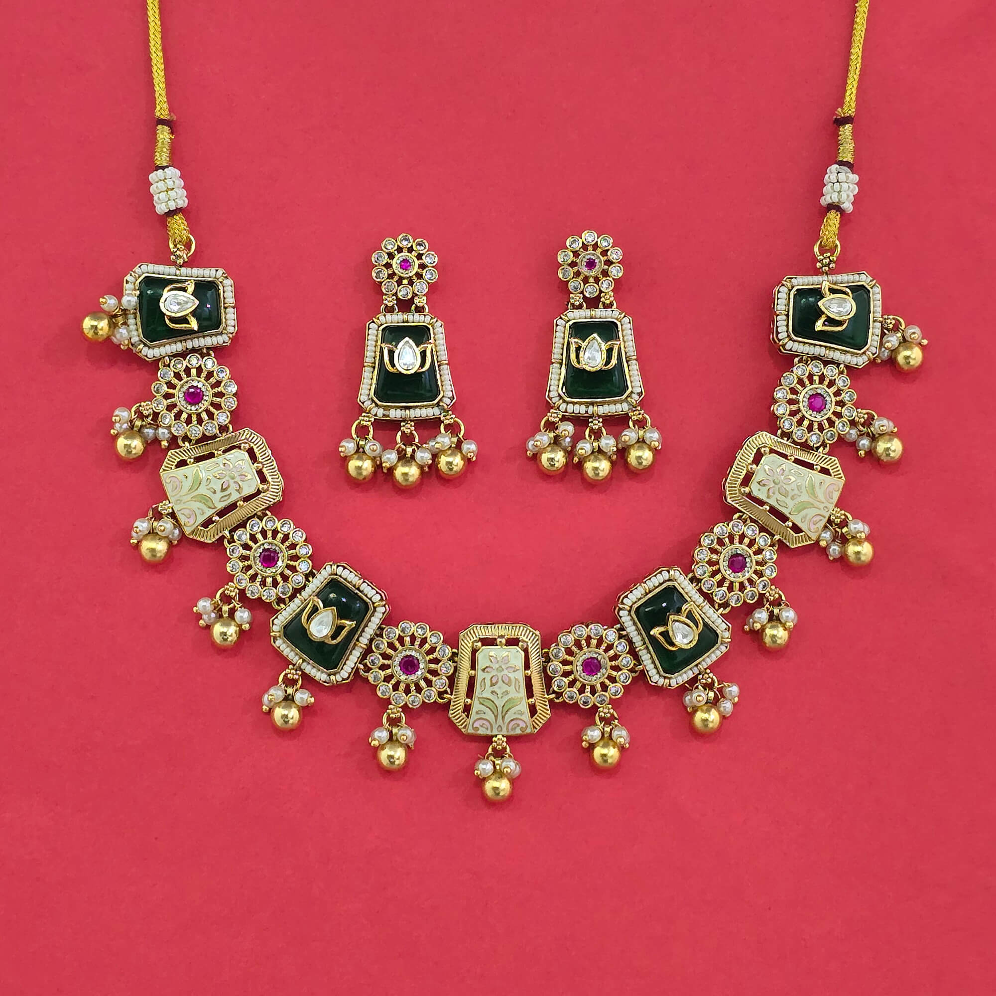 Kanhai Jewels offers an exclusive collection of finest quality crafted Fashion Jewellery in various colors. We make sure that our collection of Antique Heritage Necklace Set Set With Matte Gold Plating are beautiful, elegent & will surely galvanize you, because our products are unique, comfortable, fashion forward & very popular for the rich look. Base Metal of our product is Alloy, i.e Mixing of Copper & Brass. We pack all the products using quality packaging material to ensure safe and secure transportation.