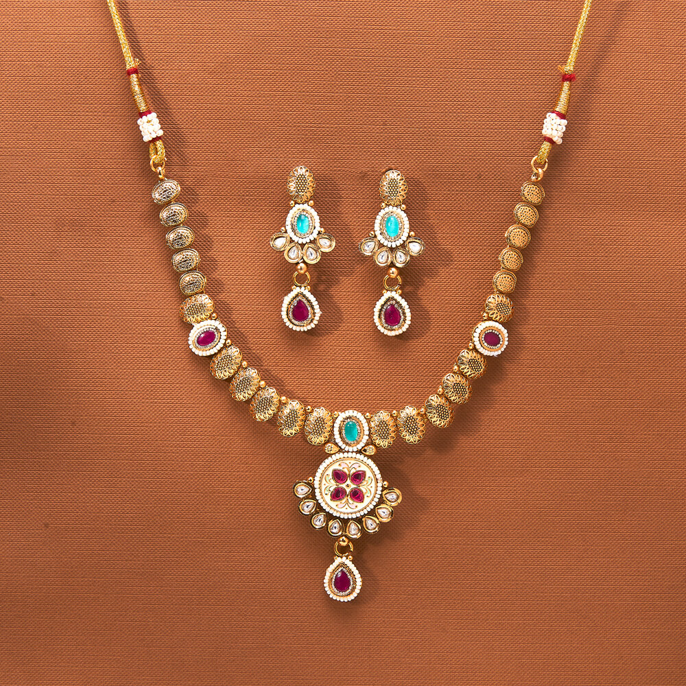 Kanhai Jewels offers an exclusive collection of finest quality crafted Fashion Jewellery in various colors. We make sure that our collection of Antique Meenakari Necklace With Matte Gold Plating are beautiful, elegent & will surely galvanize you, because our products are unique, comfortable, fashion forward & very popular for the rich look. Base Metal of our product is Alloy, i.e Mixing of Copper & Brass. We pack all the products using quality packaging material to ensure safe and secure transportation.