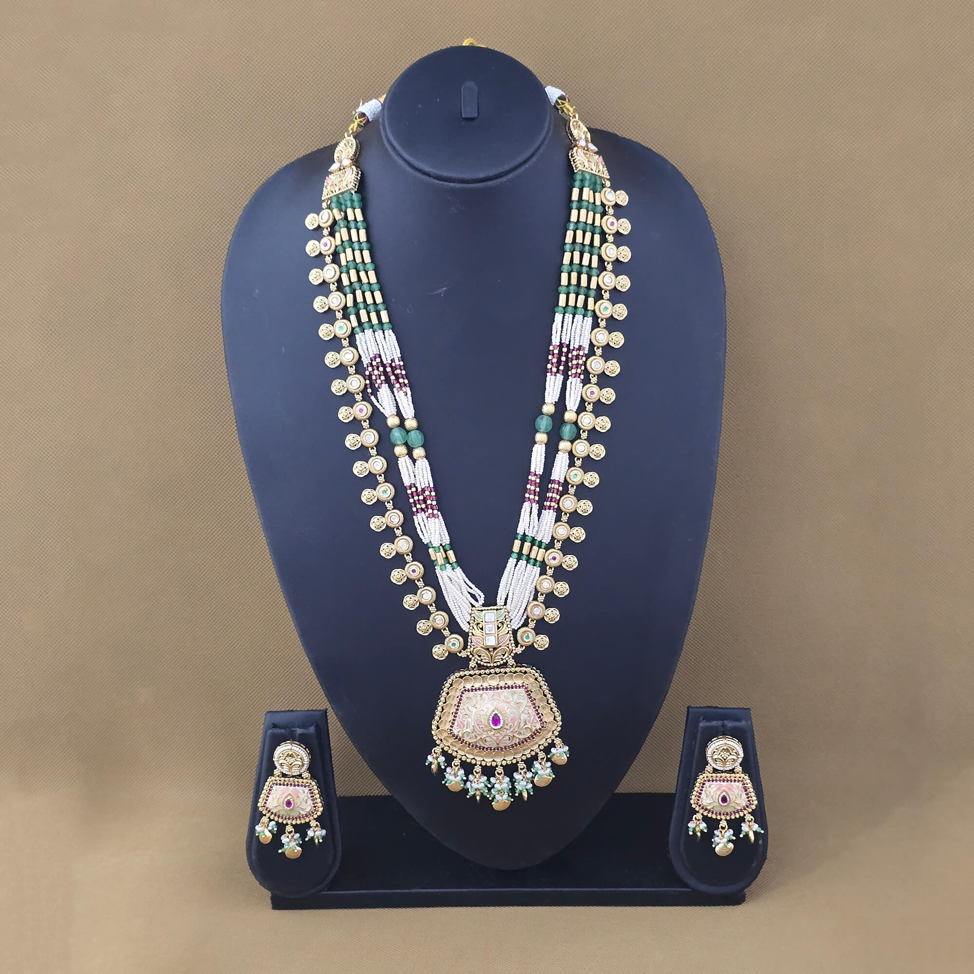 Kanhai Jewels offers an exclusive collection of finest quality crafted Fashion Jewellery in various colors. We make sure that our collection of Antique Meenakari Pendant Set With Gold Plating are beautiful, elegent & will surely galvanize you, because our products are unique, comfortable, fashion forward & very popular for the rich look. Base Metal of our product is Alloy, i.e Mixing of Copper & Brass. We pack all the products using quality packaging material to ensure safe and secure transportation.