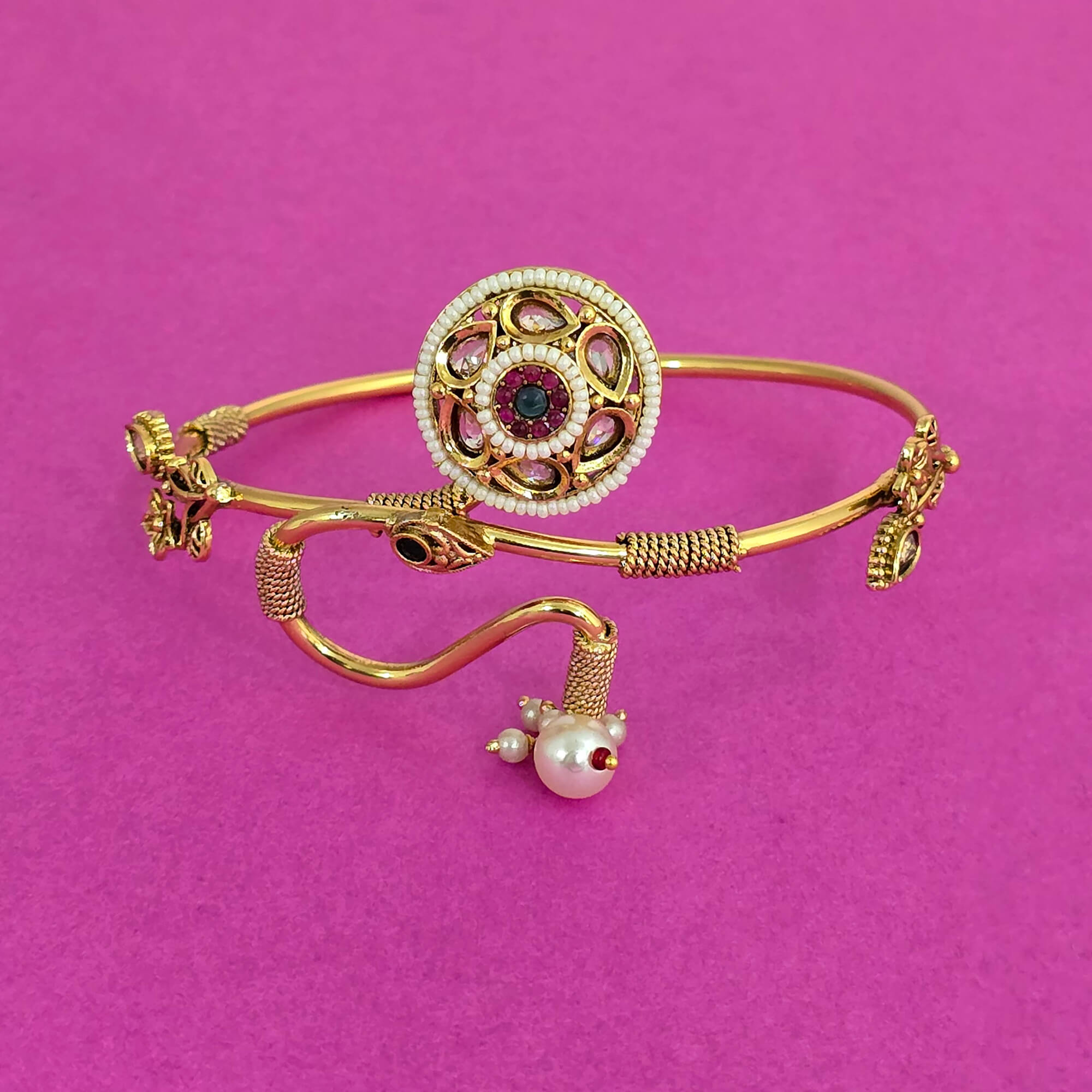 Kanhai Jewels offers an exclusive collection of finest quality crafted Fashion Jewellery in various colors. We make sure that our collection of Antique Moti Baju Band With Gold Plating are beautiful, elegent & will surely galvanize you, because our products are unique, comfortable, fashion forward & very popular for the rich look. Base Metal of our product is Alloy, i.e Mixing of Copper & Brass. We pack all the products using quality packaging material to ensure safe and secure transportation.