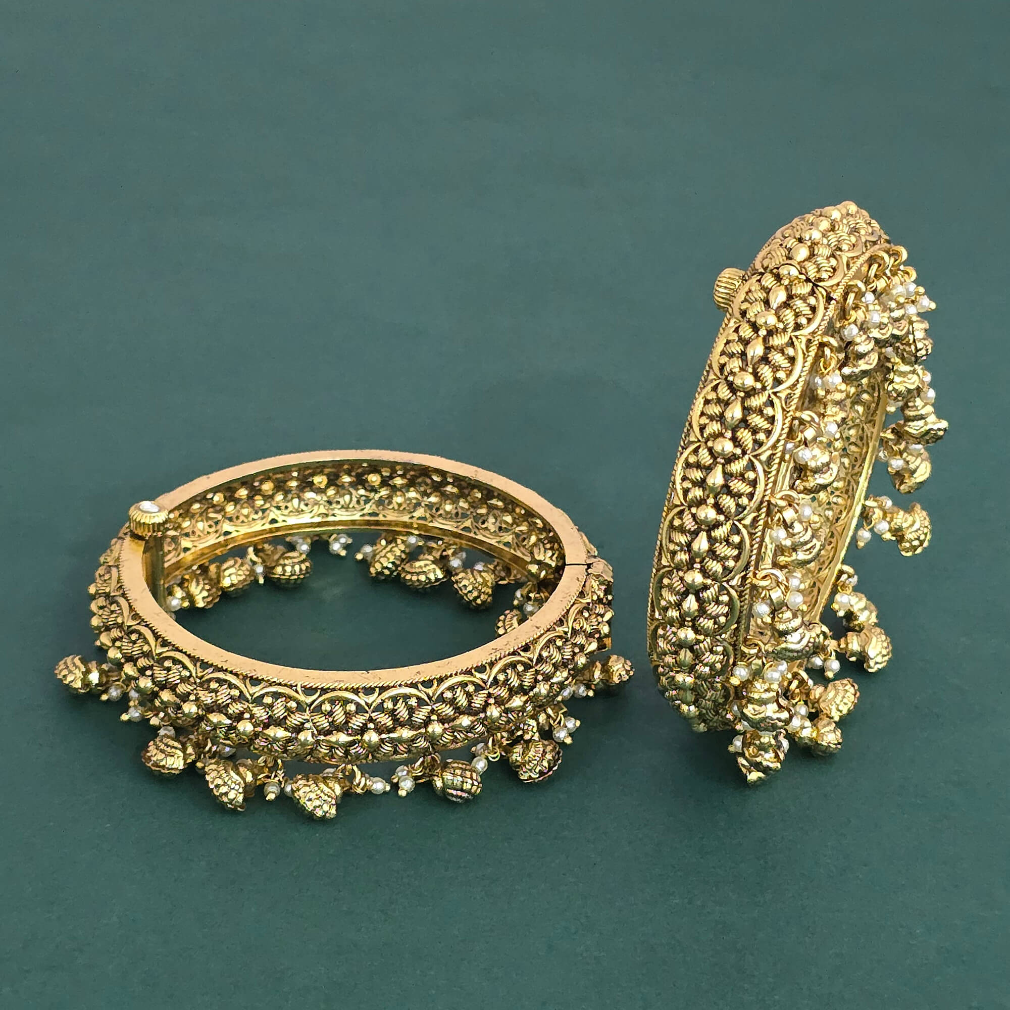 Kanhai Jewels offers an exclusive collection of finest quality crafted Fashion Jewellery in various colors. We make sure that our collection of Antique Moti Bangles With Matte Gold Plating are beautiful, elegent & will surely galvanize you, because our products are unique, comfortable, fashion forward & very popular for the rich look. Base Metal of our product is Alloy, i.e Mixing of Copper & Brass. We pack all the products using quality packaging material to ensure safe and secure transportation.