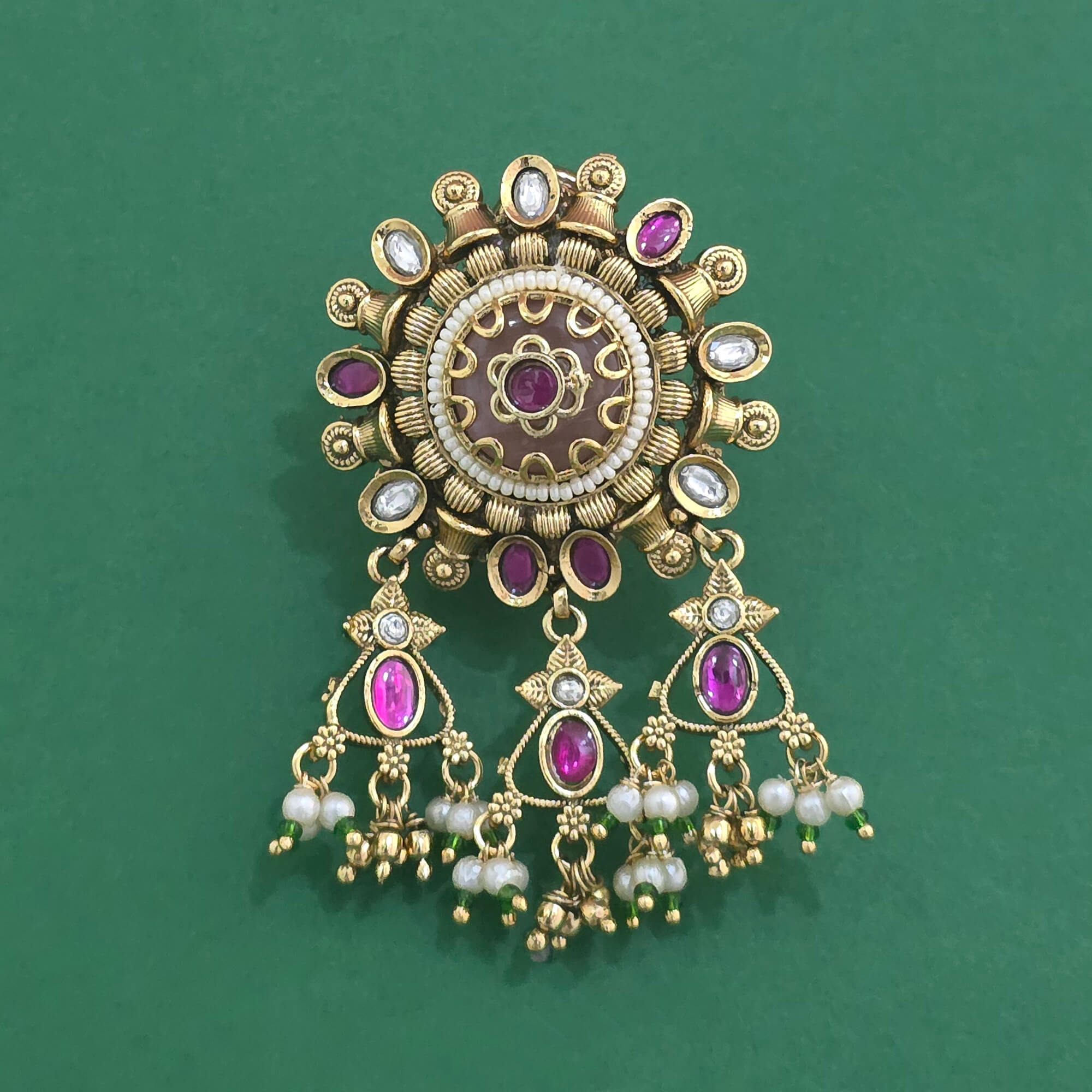 Kanhai Jewels offers an exclusive collection of finest quality crafted Fashion Jewellery in various colors. We make sure that our collection of Antique Moti Brooch With Matte Gold Plating are beautiful, elegent & will surely galvanize you, because our products are unique, comfortable, fashion forward & very popular for the rich look. Base Metal of our product is Alloy, i.e Mixing of Copper & Brass. We pack all the products using quality packaging material to ensure safe and secure transportation.