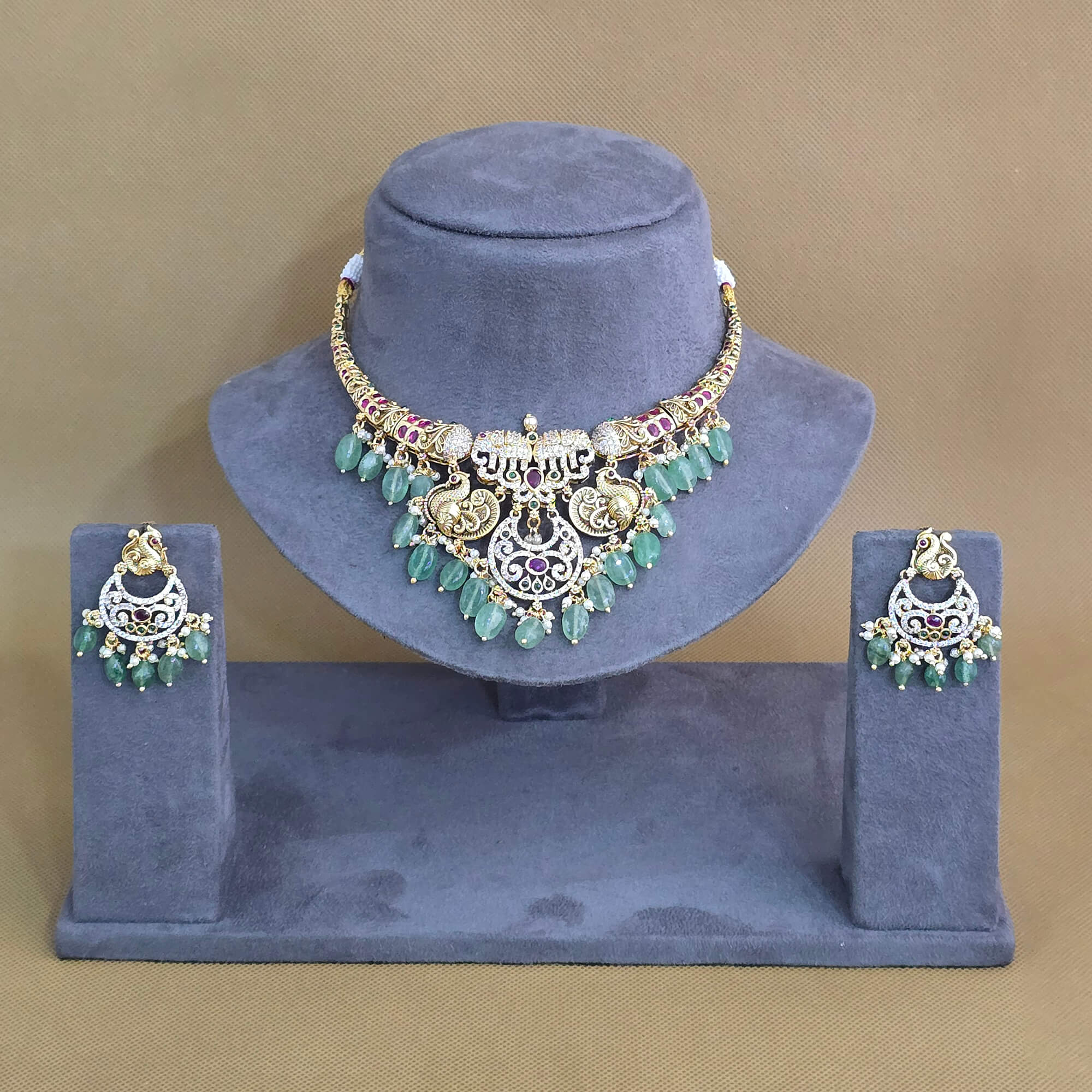 Kanhai Jewels offers an exclusive collection of finest quality crafted Fashion Jewellery in various colors. We make sure that our collection of Antique Moti Necklace Set With Matte Gold Plating are beautiful, elegent & will surely galvanize you, because our products are unique, comfortable, fashion forward & very popular for the rich look. Base Metal of our product is Alloy, i.e Mixing of Copper & Brass. We pack all the products using quality packaging material to ensure safe and secure transportation.