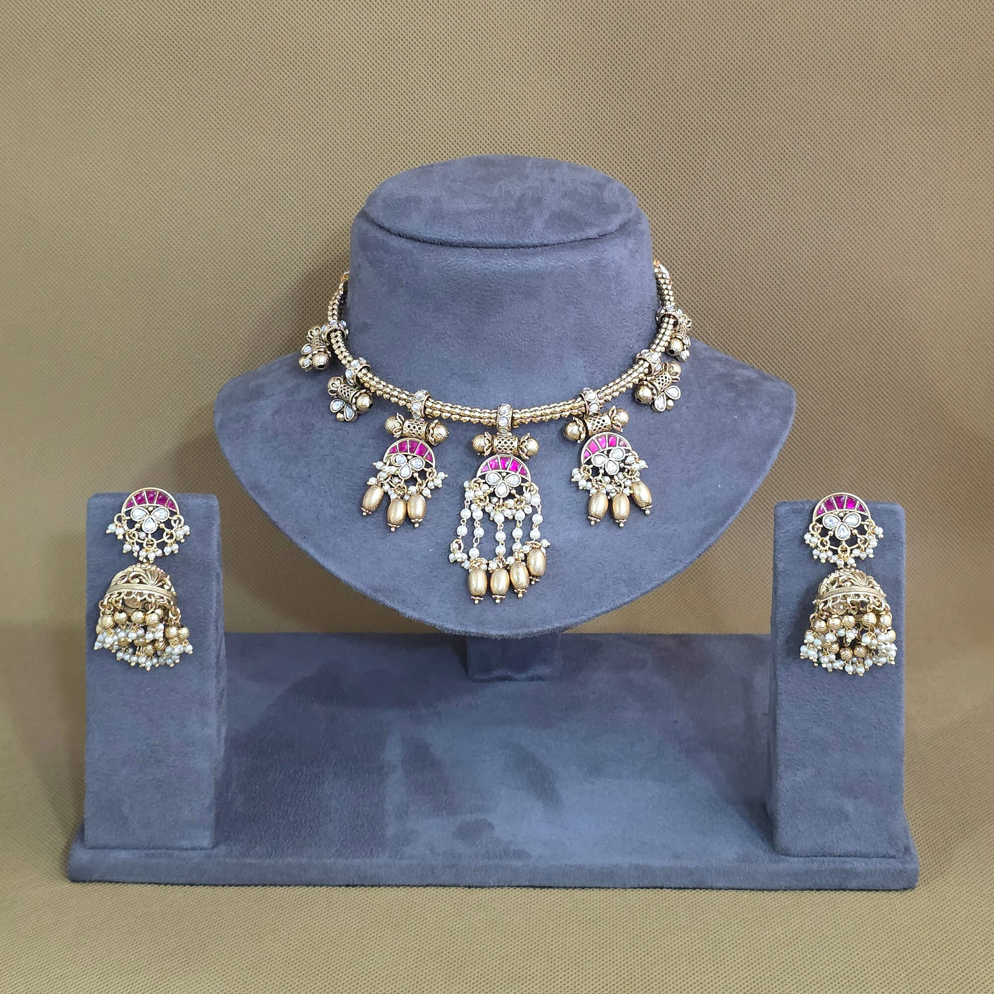 Kanhai Jewels offers an exclusive collection of finest quality crafted Fashion Jewellery in various colors. We make sure that our collection of Antique Moti Necklace Set With Matte Gold Plating are beautiful, elegent & will surely galvanize you, because our products are unique, comfortable, fashion forward & very popular for the rich look. Base Metal of our product is Alloy, i.e Mixing of Copper & Brass. We pack all the products using quality packaging material to ensure safe and secure transportation.