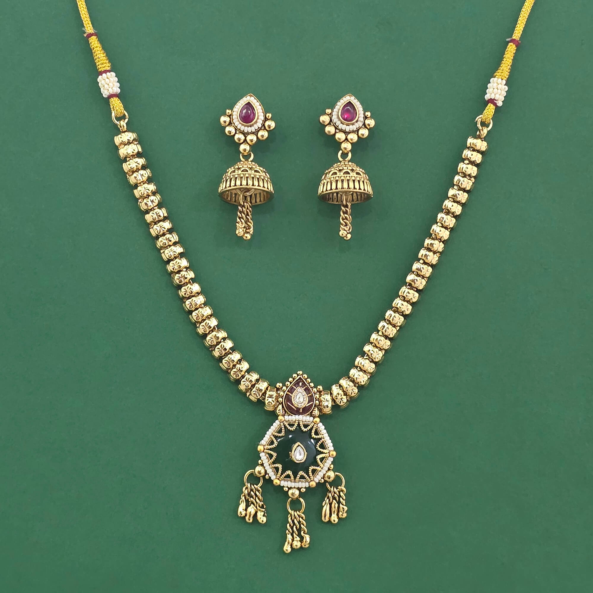Kanhai Jewels offers an exclusive collection of finest quality crafted Fashion Jewellery in various colors. We make sure that our collection of Antique Moti Necklace Set With Matte Gold Plating are beautiful, elegent & will surely galvanize you, because our products are unique, comfortable, fashion forward & very popular for the rich look. Base Metal of our product is Alloy, i.e Mixing of Copper & Brass. We pack all the products using quality packaging material to ensure safe and secure transportation.