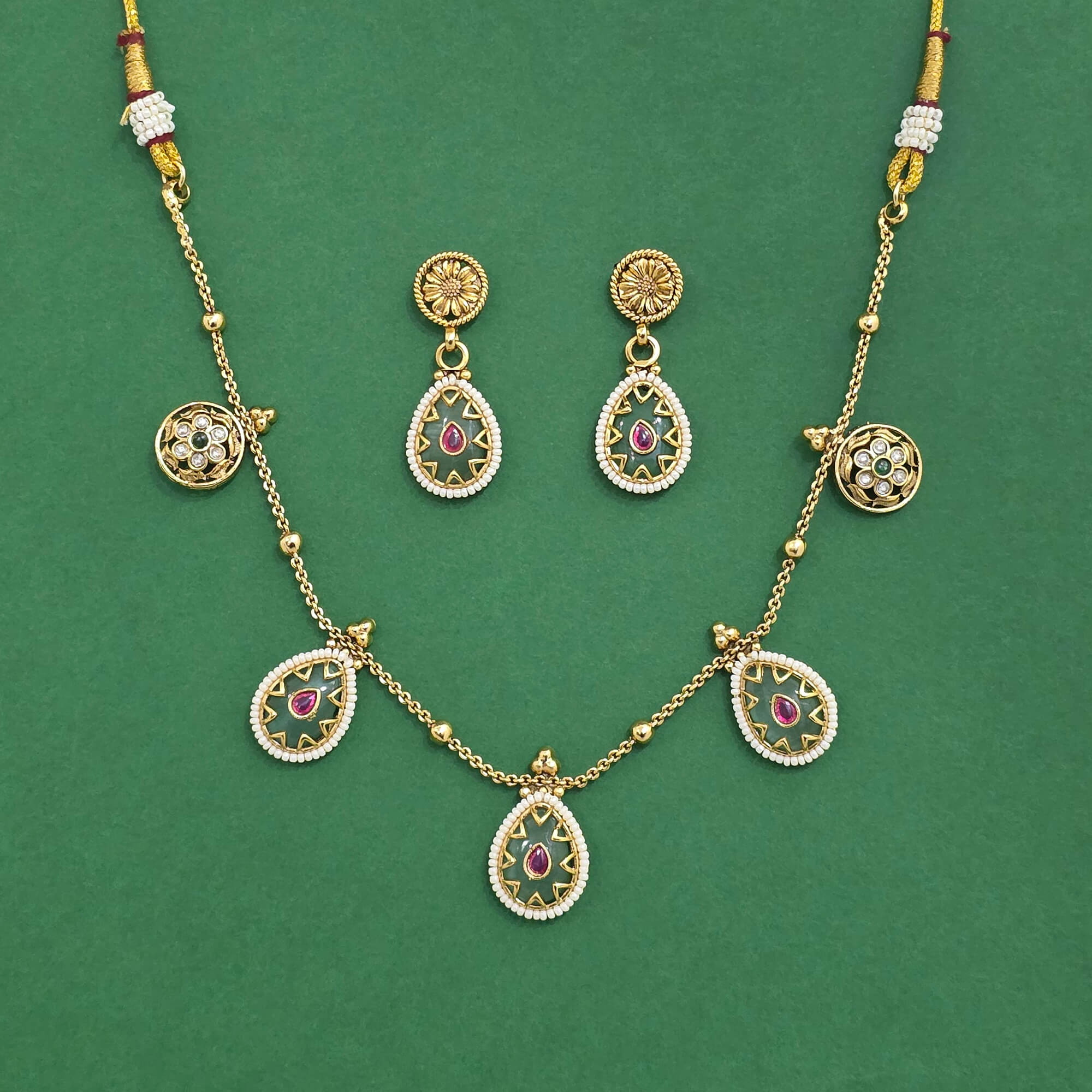 Home / Antique Necklace / antique moti necklace set with matte gold plating