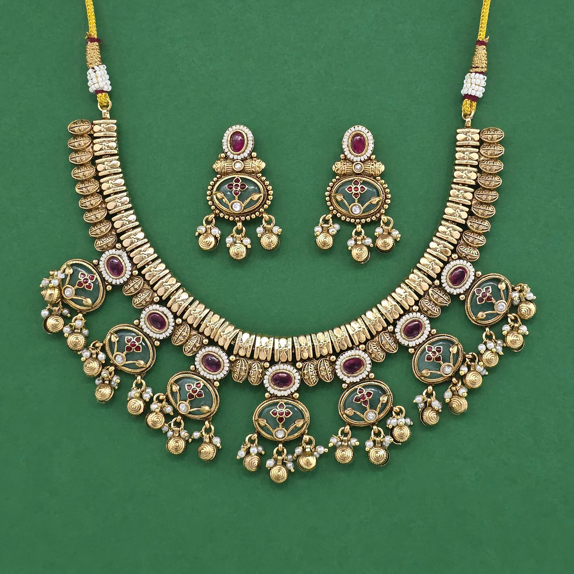 Kanhai Jewels offers an exclusive collection of finest quality crafted Fashion Jewellery in various colors. We make sure that our collection of Antique Moti Necklace Set With Matte Gold Plating are beautiful, elegent & will surely galvanize you, because our products are unique, comfortable, fashion forward & very popular for the rich look. Base Metal of our product is Alloy, i.e Mixing of Copper & Brass. We pack all the products using quality packaging material to ensure safe and secure transportation.