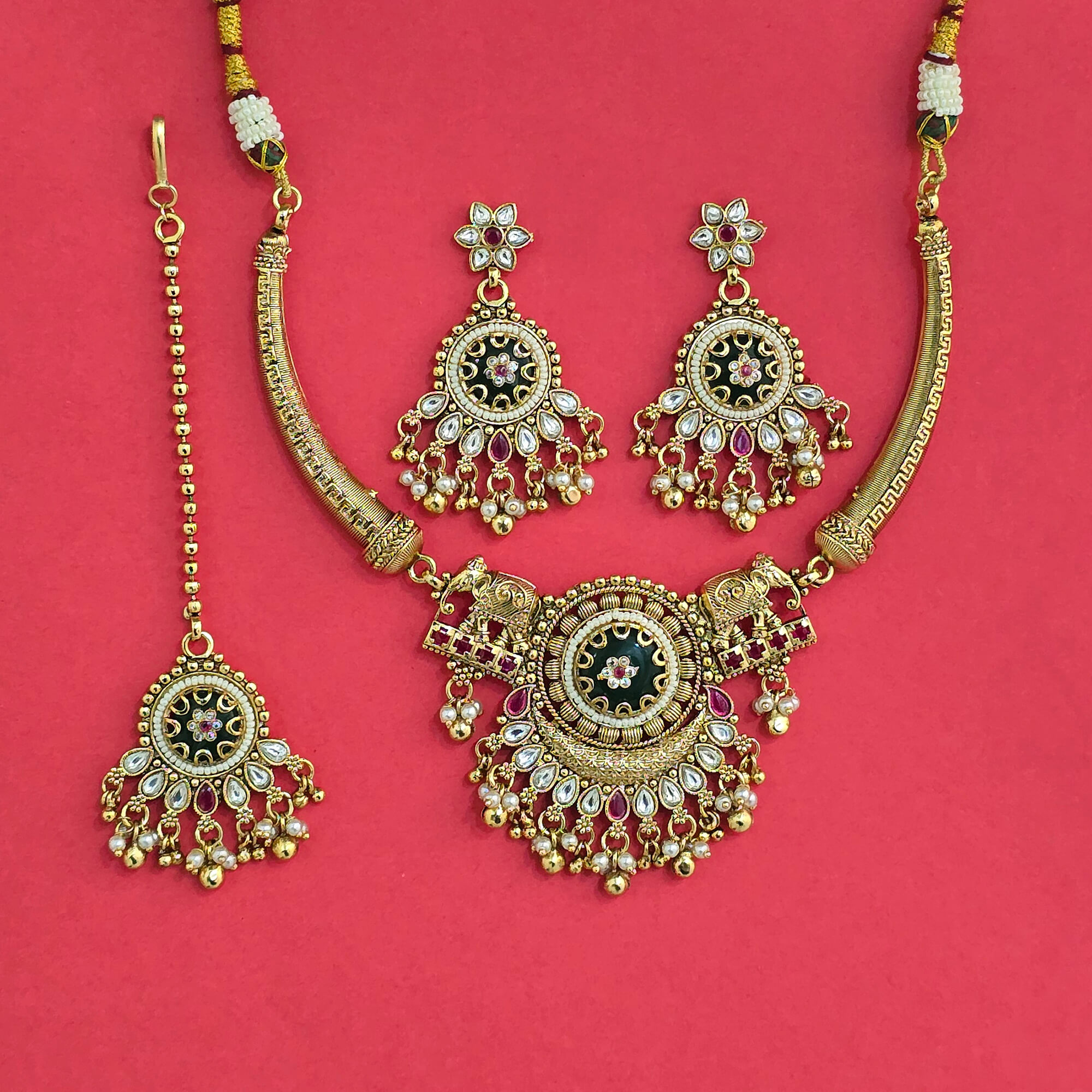 Kanhai Jewels offers an exclusive collection of finest quality crafted Fashion Jewellery in various colors. We make sure that our collection of Antique Moti Necklace Set With Matte Gold Plating are beautiful, elegent & will surely galvanize you, because our products are unique, comfortable, fashion forward & very popular for the rich look. Base Metal of our product is Alloy, i.e Mixing of Copper & Brass. We pack all the products using quality packaging material to ensure safe and secure transportation.