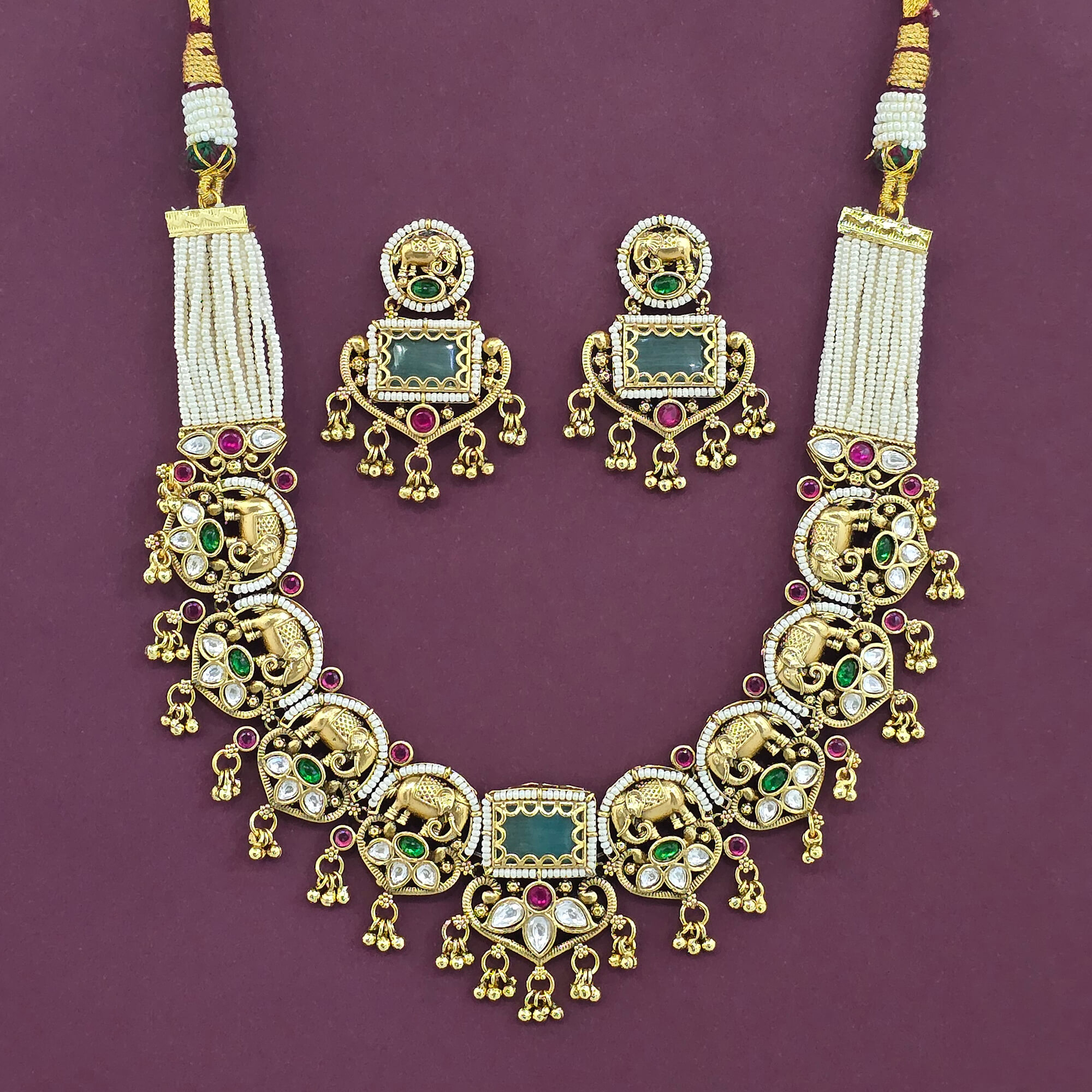 Home / Antique Necklace / antique moti necklace set with matte gold plating