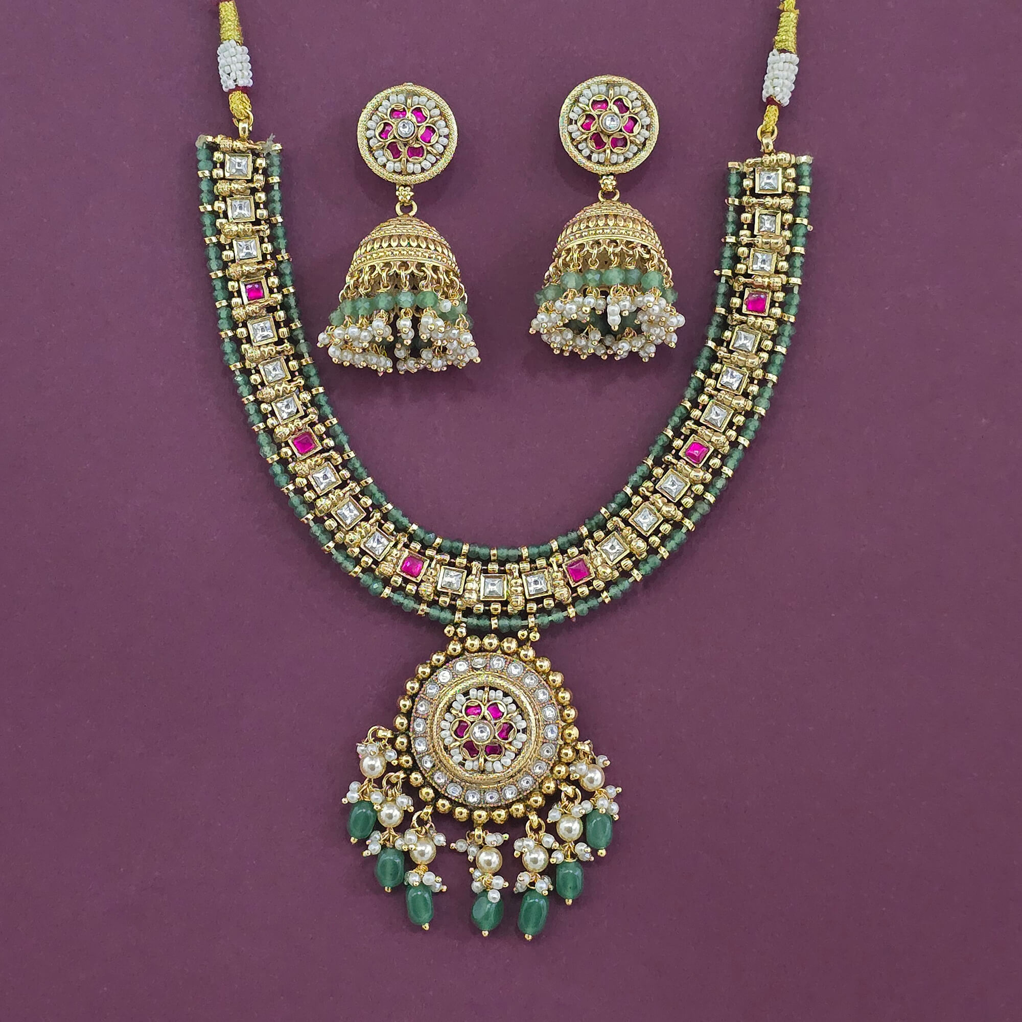 Kanhai Jewels offers an exclusive collection of finest quality crafted Fashion Jewellery in various colors. We make sure that our collection of Antique Moti Necklace Set With Matte Gold Plating are beautiful, elegent & will surely galvanize you, because our products are unique, comfortable, fashion forward & very popular for the rich look. Base Metal of our product is Alloy, i.e Mixing of Copper & Brass. We pack all the products using quality packaging material to ensure safe and secure transportation.