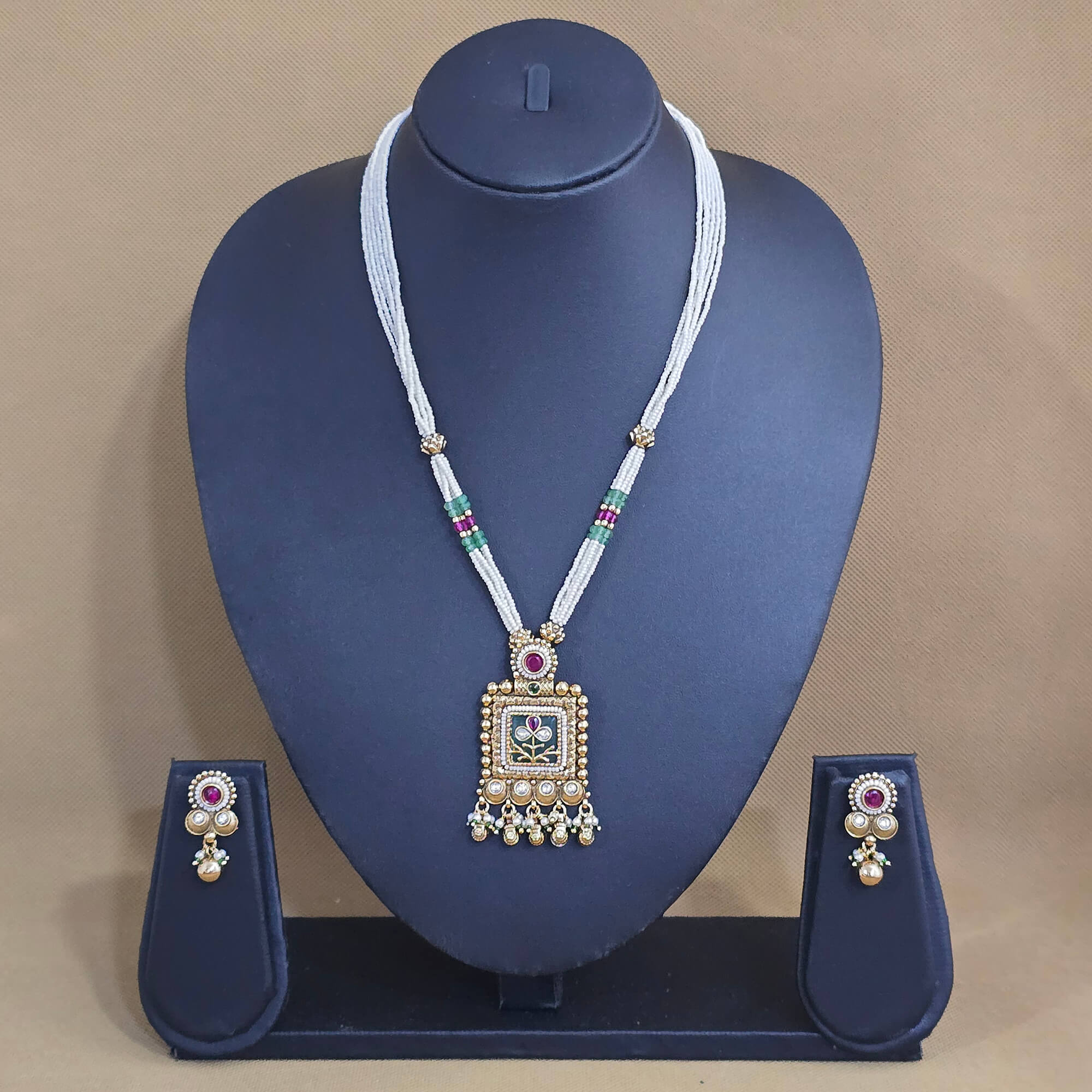 Kanhai Jewels offers an exclusive collection of finest quality crafted Fashion Jewellery in various colors. We make sure that our collection of Antique Moti Pendant Set With Matte Gold Plating are beautiful, elegent & will surely galvanize you, because our products are unique, comfortable, fashion forward & very popular for the rich look. Base Metal of our product is Alloy, i.e Mixing of Copper & Brass. We pack all the products using quality packaging material to ensure safe and secure transportation.