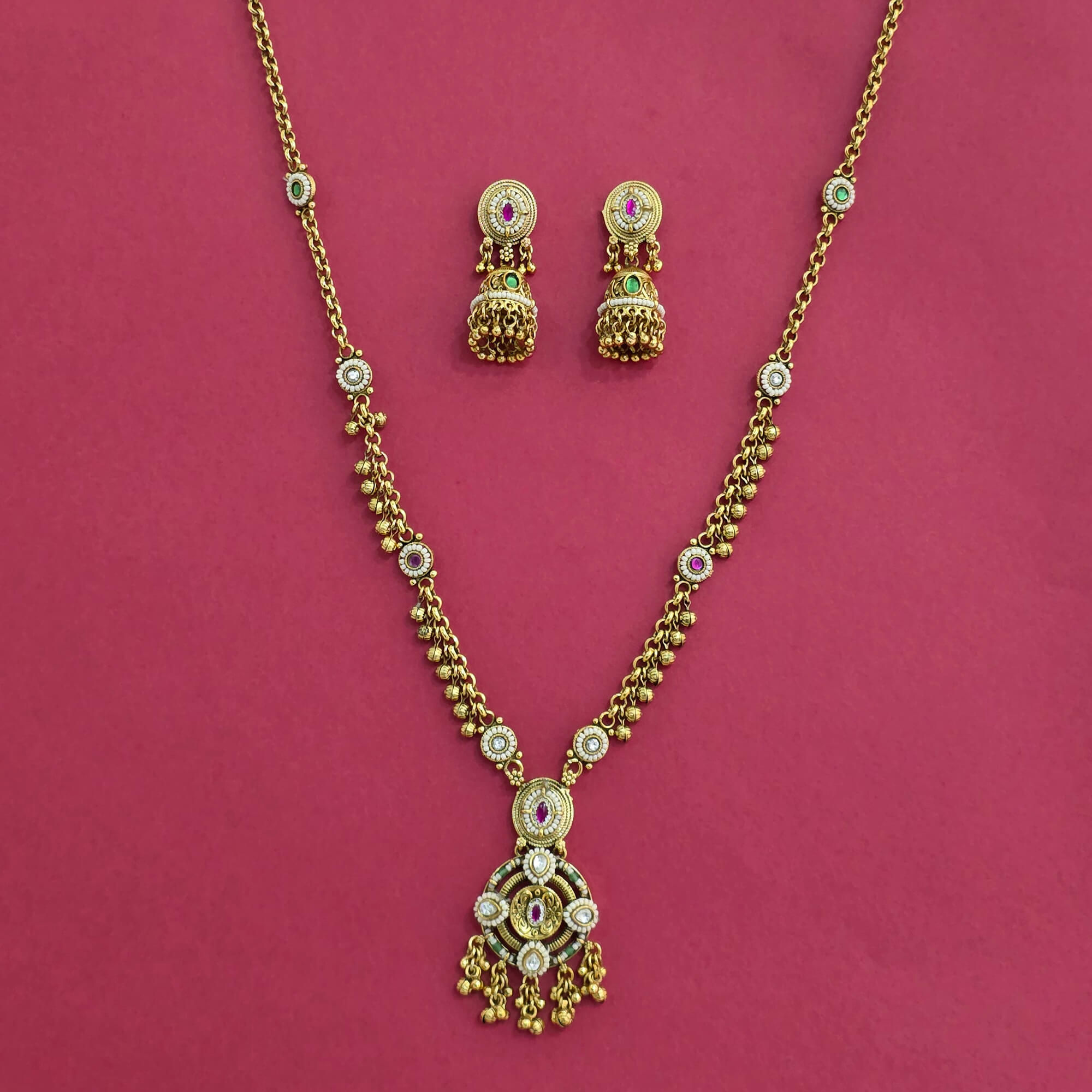 Kanhai Jewels offers an exclusive collection of finest quality crafted Fashion Jewellery in various colors. We make sure that our collection of Antique Moti Pendant Set With Matte Gold Plating are beautiful, elegent & will surely galvanize you, because our products are unique, comfortable, fashion forward & very popular for the rich look. Base Metal of our product is Alloy, i.e Mixing of Copper & Brass. We pack all the products using quality packaging material to ensure safe and secure transportation.