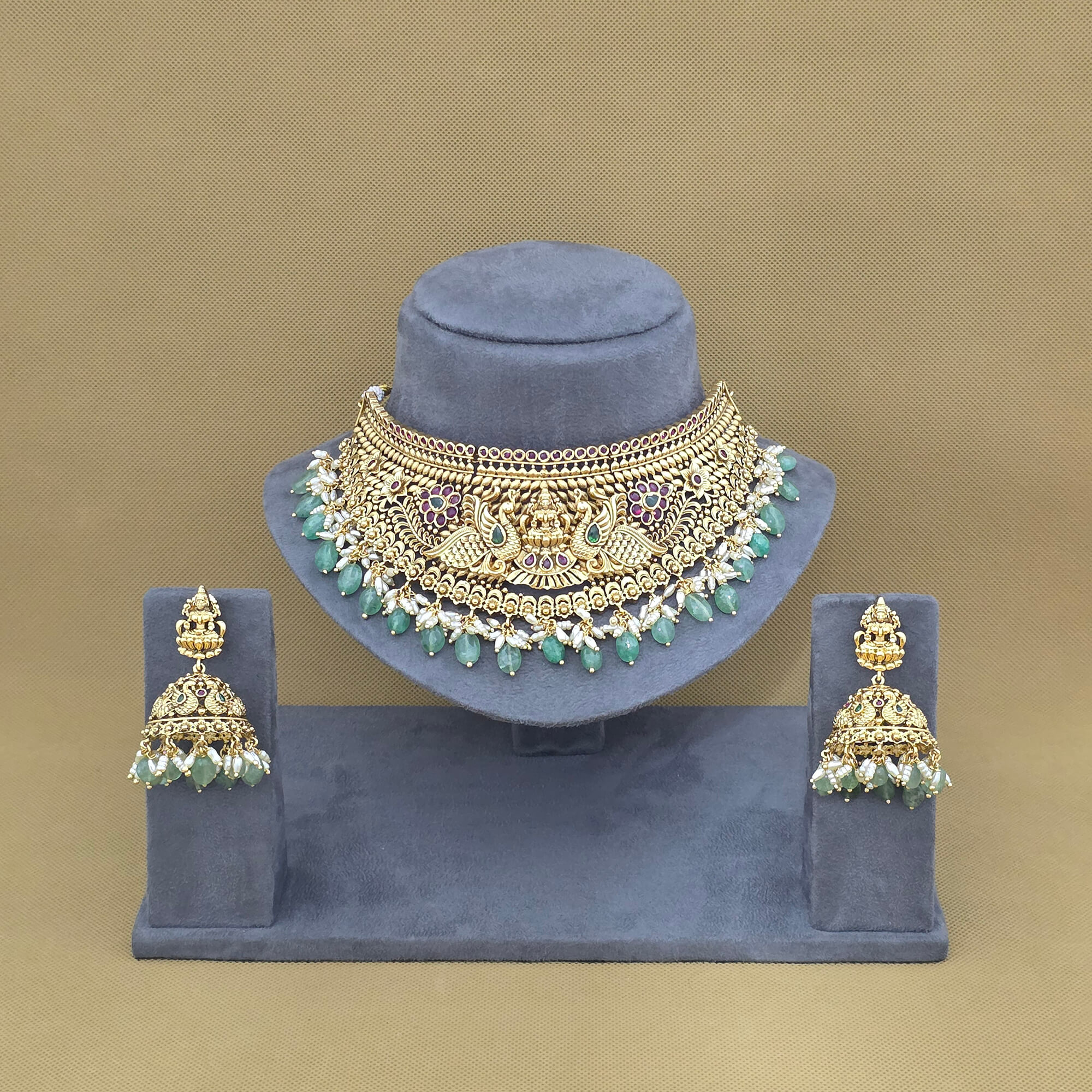 Kanhai Jewels offers an exclusive collection of finest quality crafted Fashion Jewellery in various colors. We make sure that our collection of Antique Mukut Necklace Set With Matte Gold Plating are beautiful, elegent & will surely galvanize you, because our products are unique, comfortable, fashion forward & very popular for the rich look. Base Metal of our product is Alloy, i.e Mixing of Copper & Brass. We pack all the products using quality packaging material to ensure safe and secure transportation.