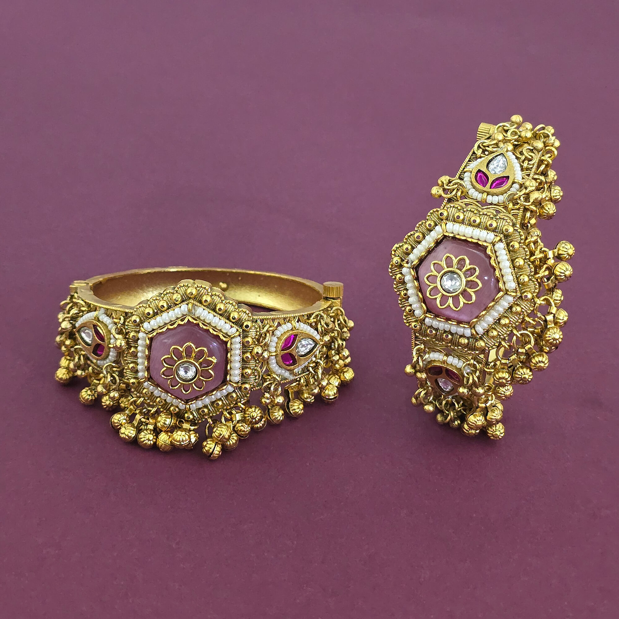 Kanhai Jewels offers an exclusive collection of finest quality crafted Fashion Jewellery in various colors. We make sure that our collection of Antique Openable Bangles With Matte Gold Plating are beautiful, elegent & will surely galvanize you, because our products are unique, comfortable, fashion forward & very popular for the rich look. Base Metal of our product is Alloy, i.e Mixing of Copper & Brass. We pack all the products using quality packaging material to ensure safe and secure transportation.