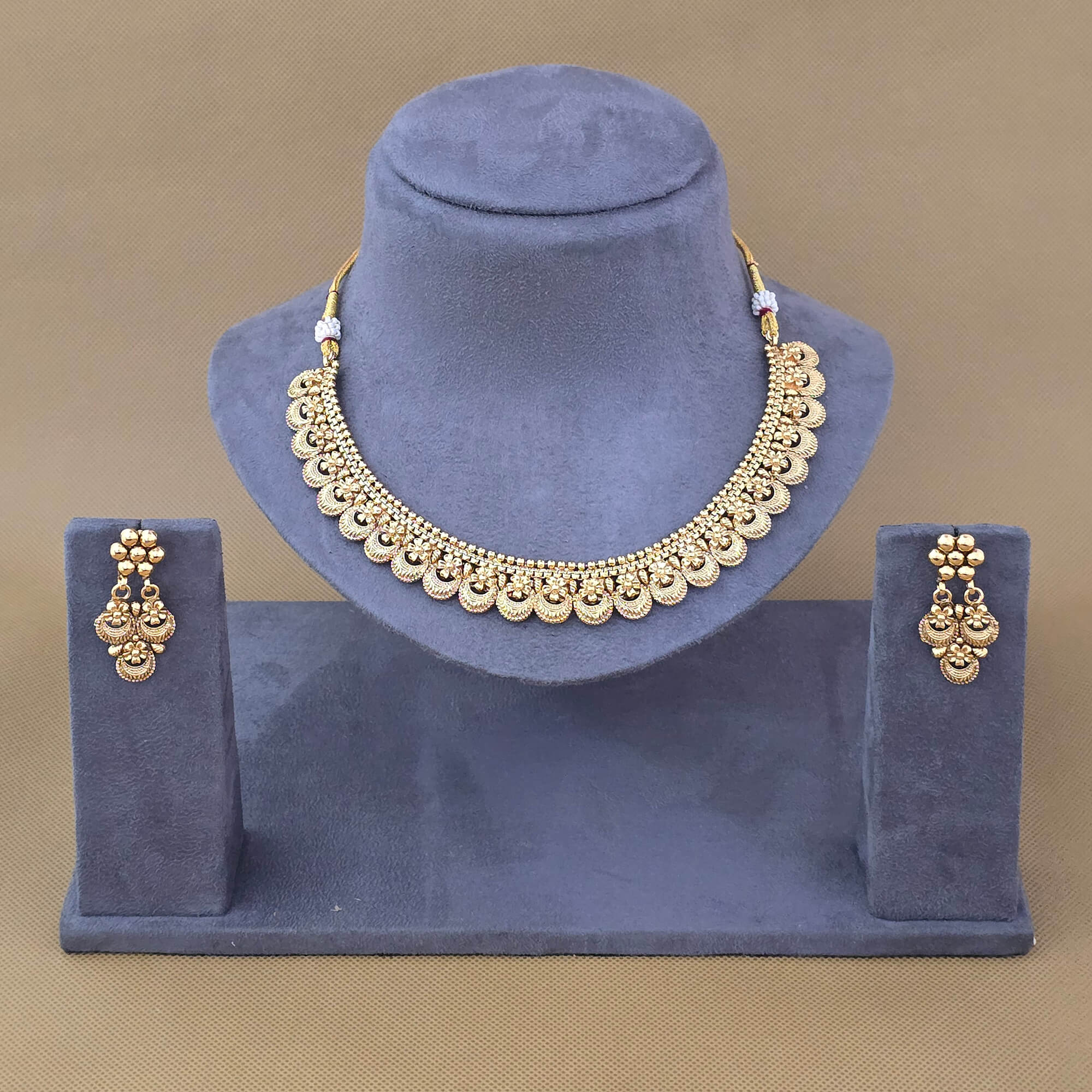 Kanhai Jewels offers an exclusive collection of finest quality crafted Fashion Jewellery in various colors. We make sure that our collection of Antique Plain Gold Necklace Set With Gold Plating are beautiful, elegent & will surely galvanize you, because our products are unique, comfortable, fashion forward & very popular for the rich look. Base Metal of our product is Alloy, i.e Mixing of Copper & Brass. We pack all the products using quality packaging material to ensure safe and secure transportation.