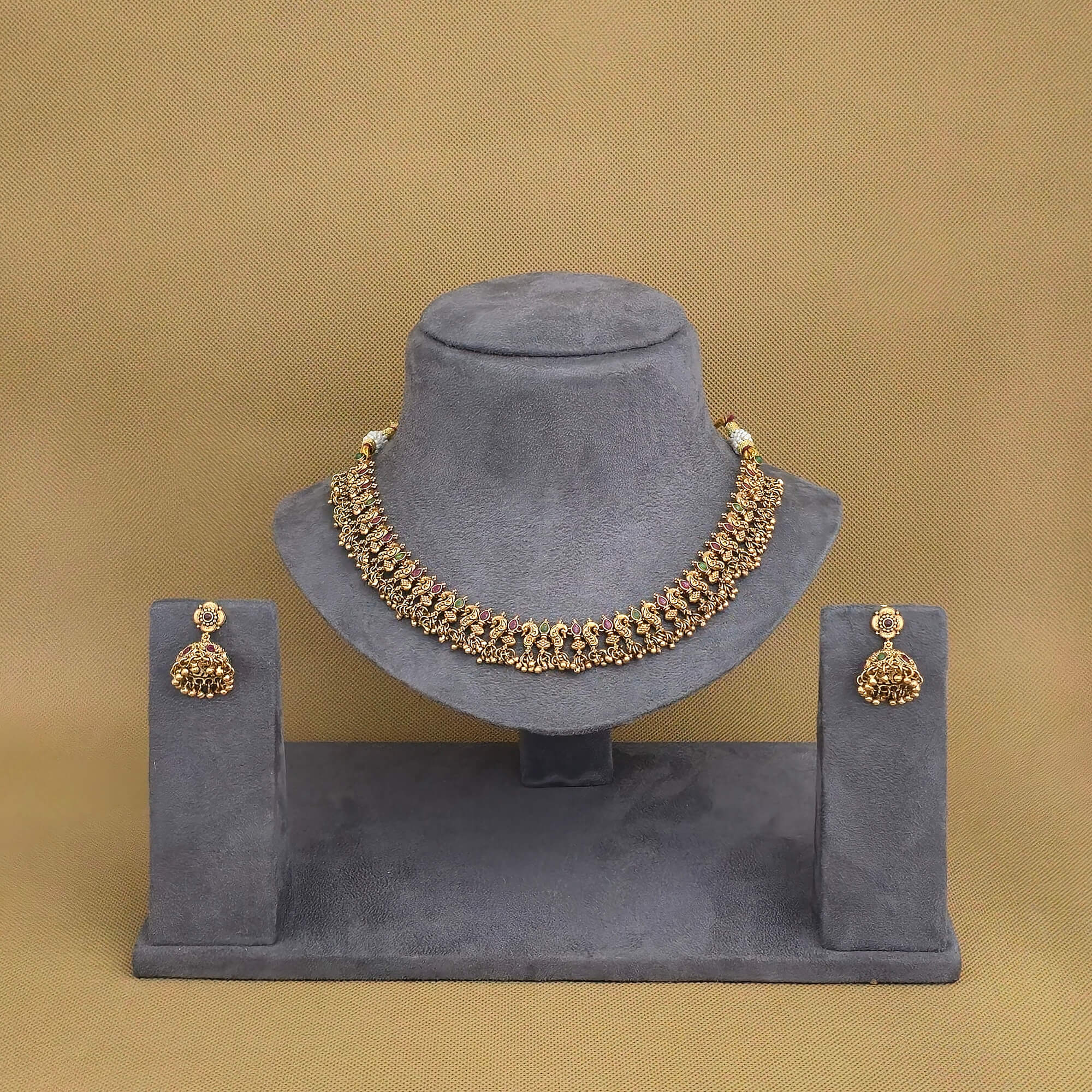 Kanhai Jewels offers an exclusive collection of finest quality crafted Fashion Jewellery in various colors. We make sure that our collection of Antique South Indian Necklace Set With Gold Plating are beautiful, elegent & will surely galvanize you, because our products are unique, comfortable, fashion forward & very popular for the rich look. Base Metal of our product is Alloy, i.e Mixing of Copper & Brass. We pack all the products using quality packaging material to ensure safe and secure transportation.