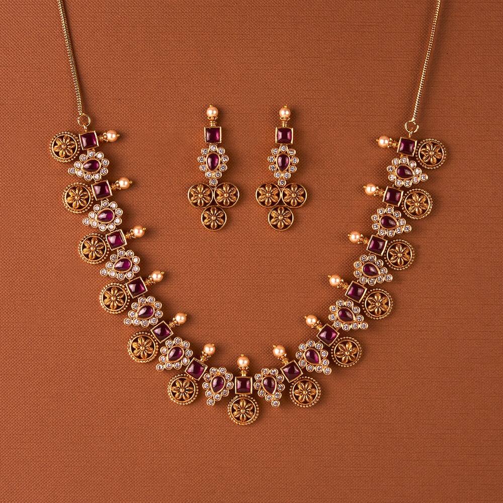 Home / Antique Necklace / antique south indian necklace set with matte gold plating