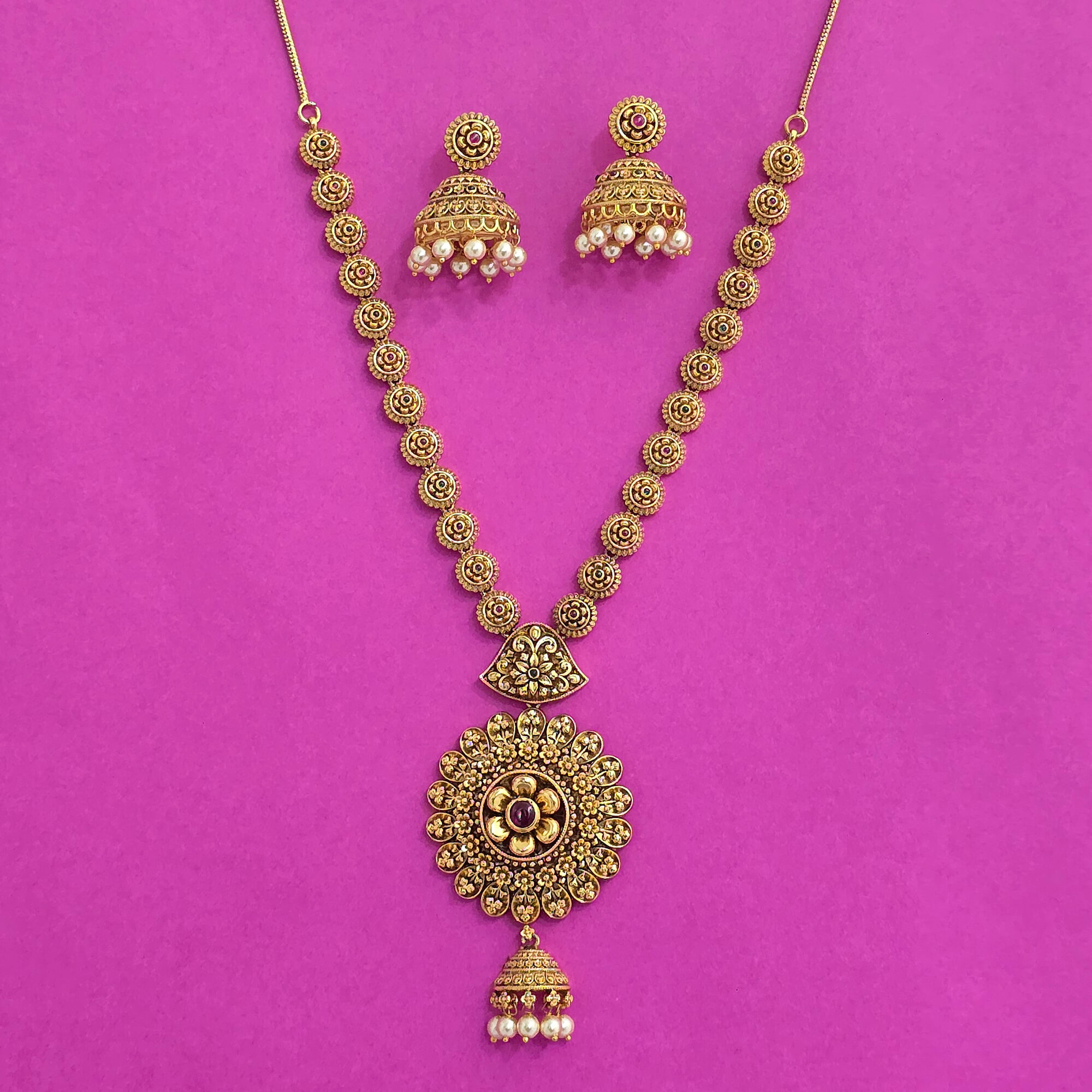 227079 Antique South Indian Necklace Set With Matte Gold Plating