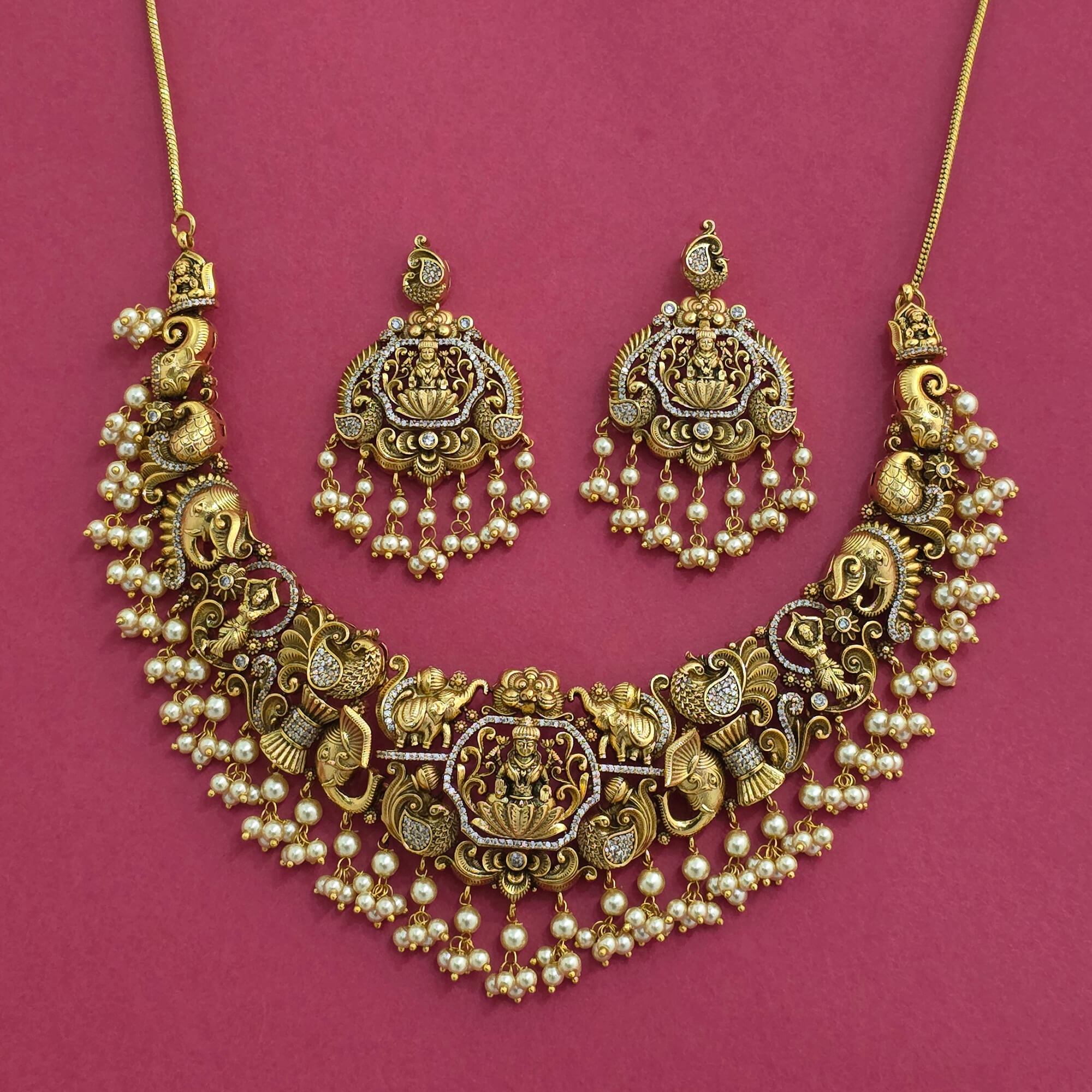 • Antique South Indian Necklace Set With Matte Gold Plating