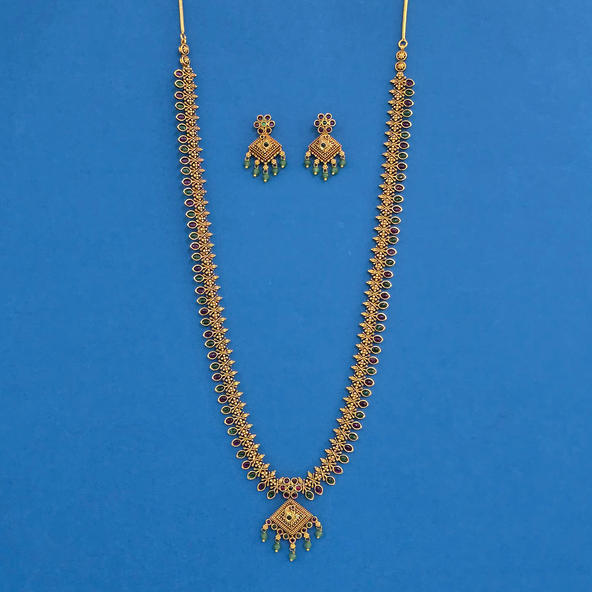 Home / Antique Necklace / antique south indian necklace set with matte gold plating