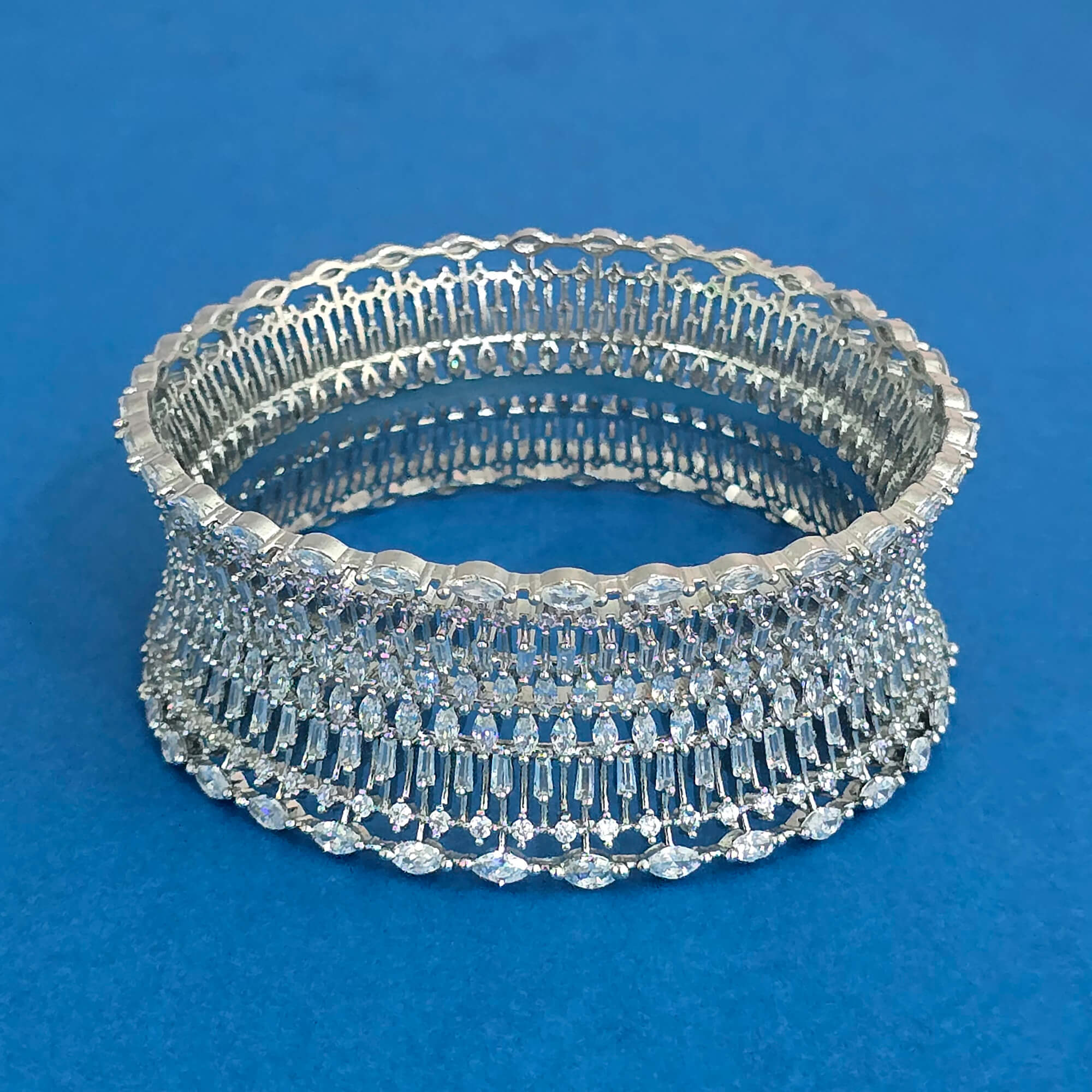 Kanhai Jewels offers an exclusive collection of finest quality crafted Fashion Jewellery in various colors. We make sure that our collection of Cubic Zirconia Classic Bangles With Rhodium Plating are beautiful, elegent & will surely galvanize you, because our products are unique, comfortable, fashion forward & very popular for the rich look. Base Metal of our product is Alloy, i.e Mixing of Copper & Brass. We pack all the products using quality packaging material to ensure safe and secure transportation.