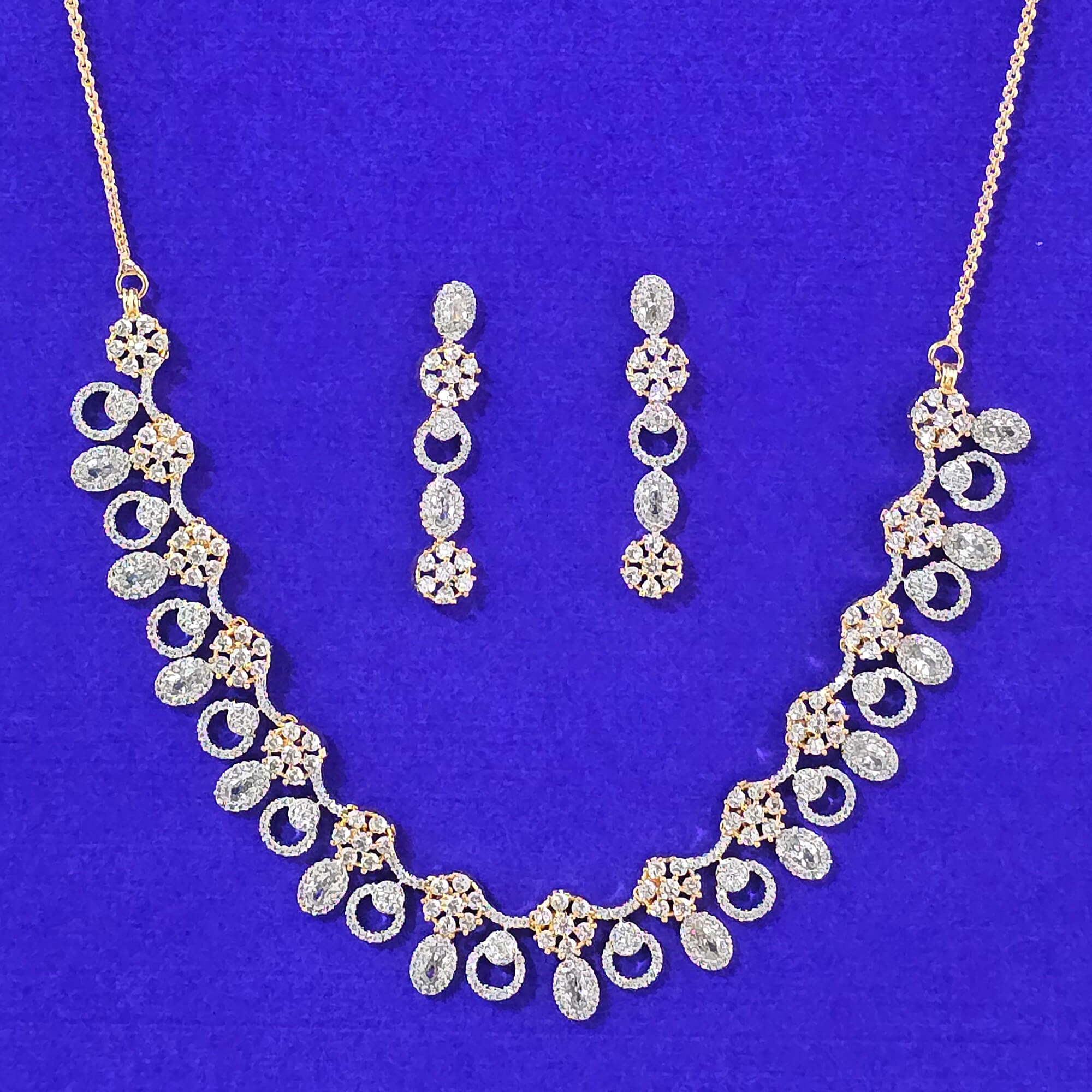 Kanhai Jewels offers an exclusive collection of finest quality crafted Fashion Jewellery in various colors. We make sure that our collection of Cubic Zirconia Classic Necklace Set With Carat Gold Plating are beautiful, elegent & will surely galvanize you, because our products are unique, comfortable, fashion forward & very popular for the rich look. Base Metal of our product is Alloy, i.e Mixing of Copper & Brass. We pack all the products using quality packaging material to ensure safe and secure transportation.