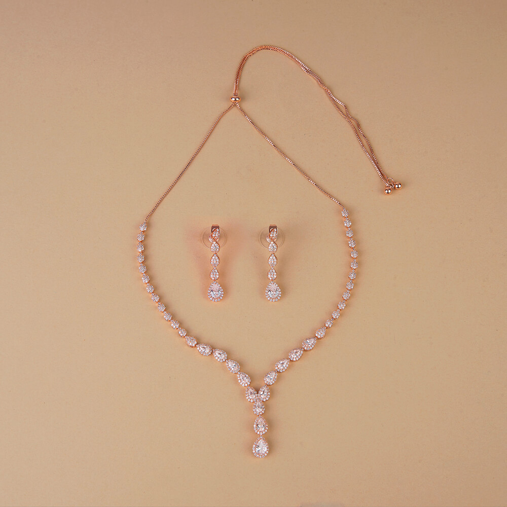 Kanhai Jewels offers an exclusive collection of finest quality crafted Fashion Jewellery in various colors. We make sure that our collection of Cubic Zirconia Delicate Necklace With Rose Rhodium Gold Plating are beautiful, elegent & will surely galvanize you, because our products are unique, comfortable, fashion forward & very popular for the rich look. Base Metal of our product is Alloy, i.e Mixing of Copper, Brass & Zinc. We pack all the products using quality packaging material to ensure safe and secure transportation.