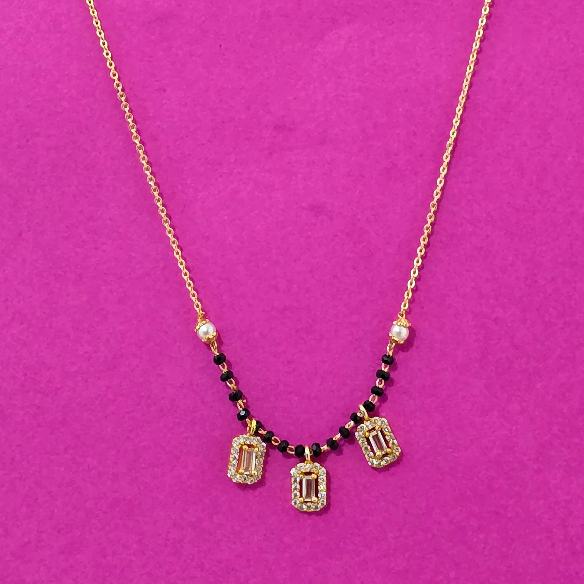 Kanhai Jewels offers an exclusive collection of finest quality crafted Fashion Jewellery in various colors. We make sure that our collection of Cubic Zirconia Dokiya Mangalsutra Set With Gold Plating are beautiful, elegent & will surely galvanize you, because our products are unique, comfortable, fashion forward & very popular for the rich look. Base Metal of our product is Alloy, i.e Mixing of Copper & Brass. We pack all the products using quality packaging material to ensure safe and secure transportation.