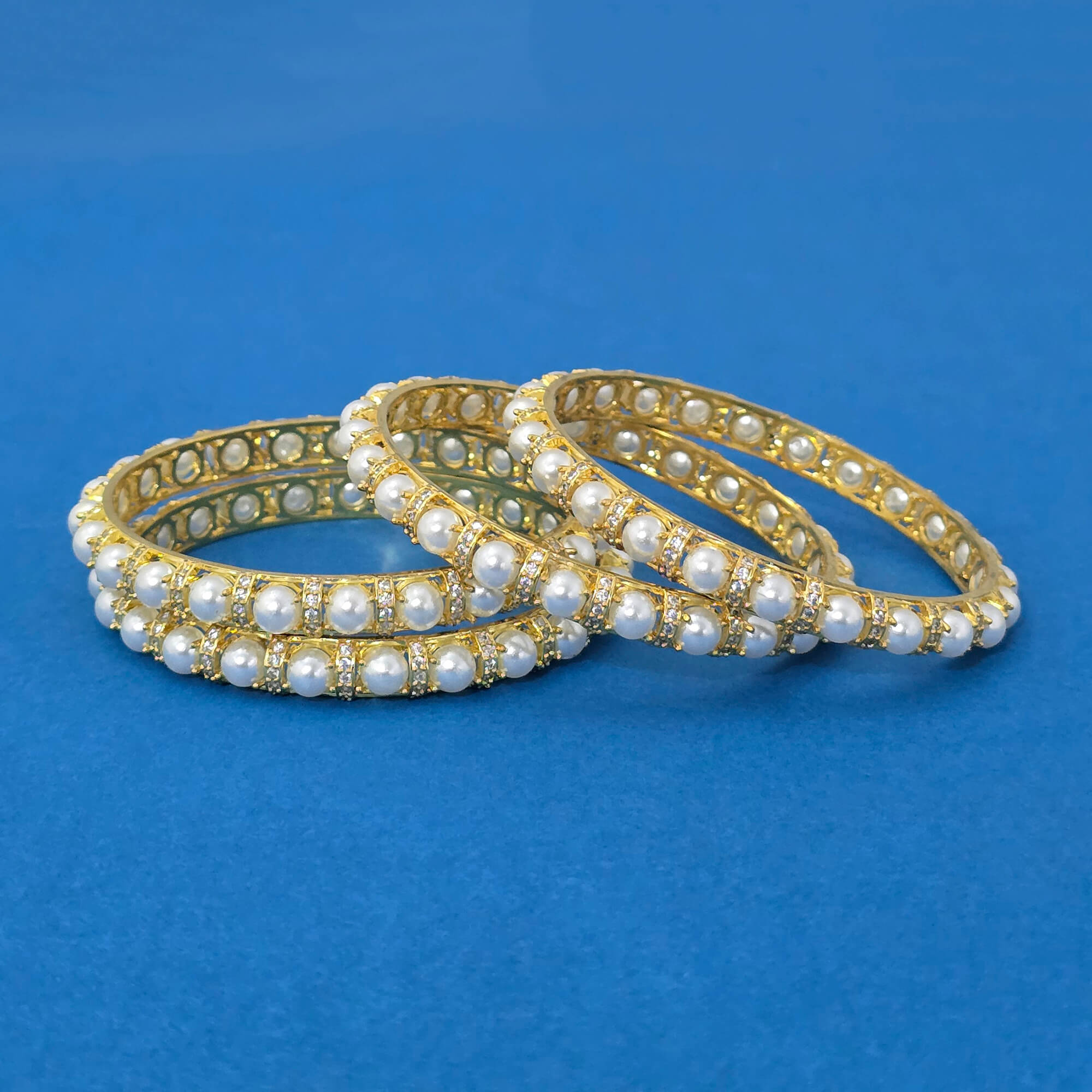 Kanhai Jewels offers an exclusive collection of finest quality crafted Fashion Jewellery in various colors. We make sure that our collection of Cubic Zirconia Moti Bangles With Gold Plating are beautiful, elegent & will surely galvanize you, because our products are unique, comfortable, fashion forward & very popular for the rich look. Base Metal of our product is Alloy, i.e Mixing of Copper & Brass. We pack all the products using quality packaging material to ensure safe and secure transportation.