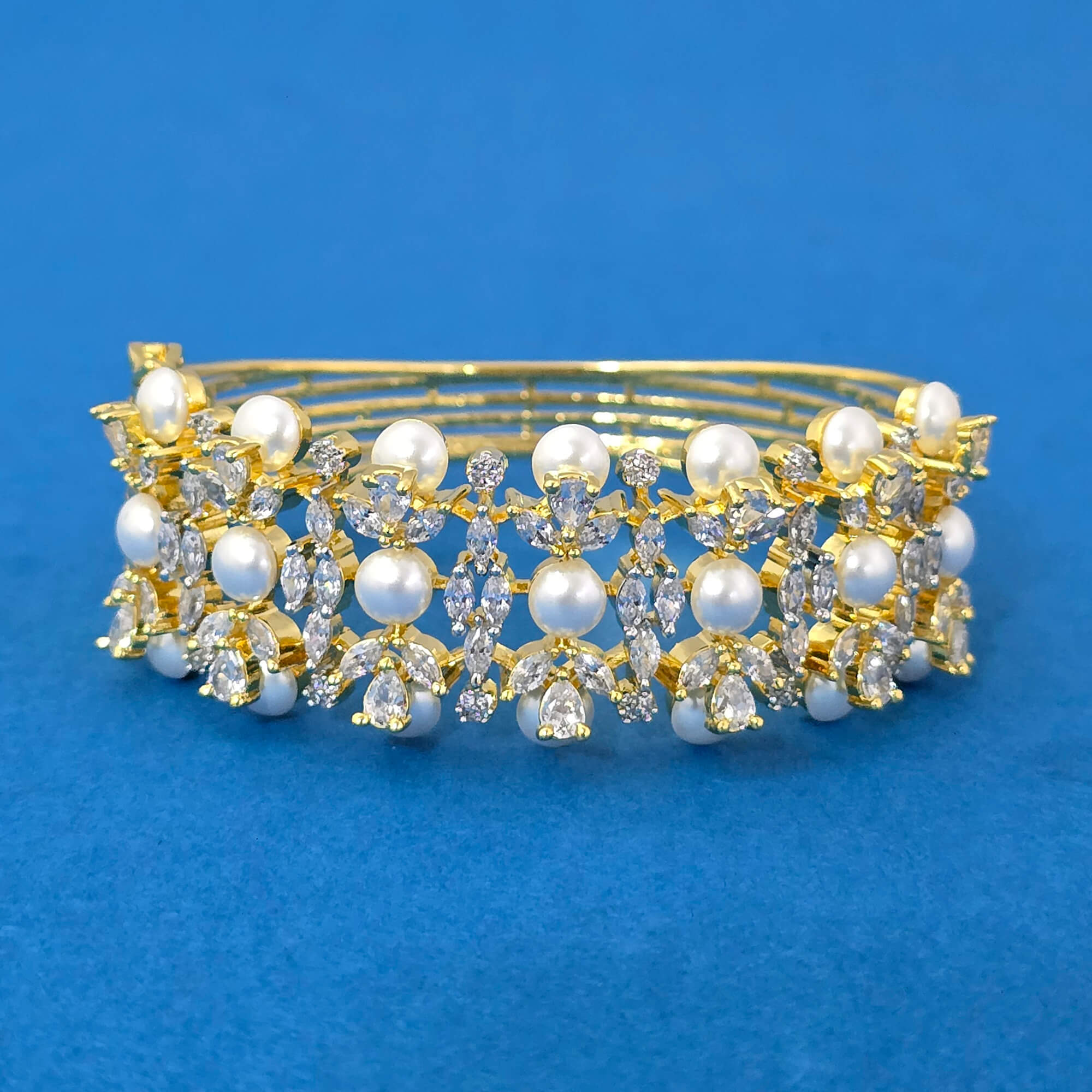 Kanhai Jewels offers an exclusive collection of finest quality crafted Fashion Jewellery in various colors. We make sure that our collection of Cubic Zirconia Moti Kada With Mehndi 2 Tone Rhodium Plating are beautiful, elegent & will surely galvanize you, because our products are unique, comfortable, fashion forward & very popular for the rich look. Base Metal of our product is Alloy, i.e Mixing of Copper & Brass. We pack all the products using quality packaging material to ensure safe and secure transportation.