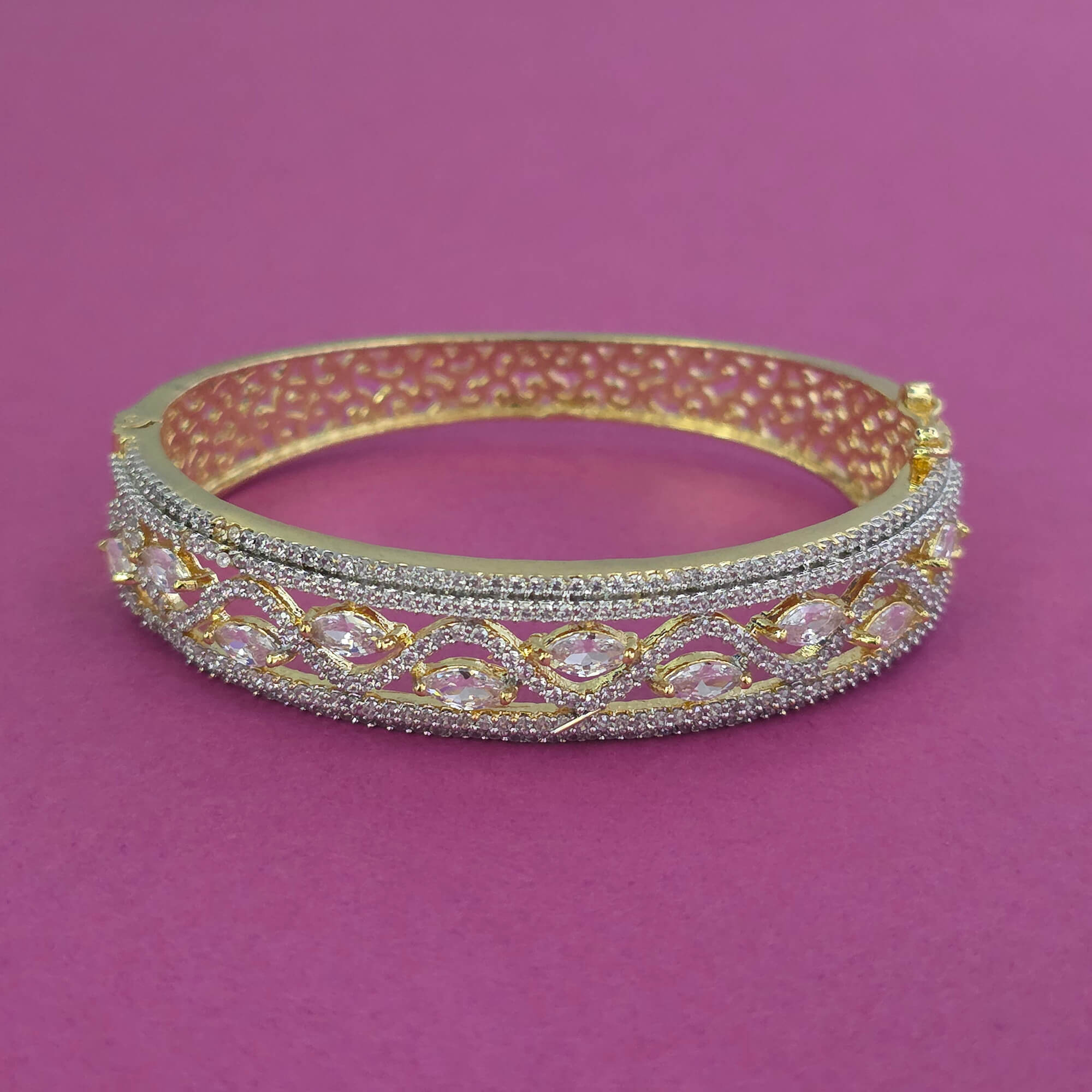 Kanhai Jewels offers an exclusive collection of finest quality crafted Fashion Jewellery in various colors. We make sure that our collection of Cubic Zirconia Kada with 2 Tone Plating are beautiful, elegant & will surely galvanize you, because our products are unique, comfortable, fashion forward & very popular for the rich look. Base Metal of our product is Alloy, i.e mixing of Copper & Brass. We pack all the products using quality packaging material to ensure safe and secure transportation.