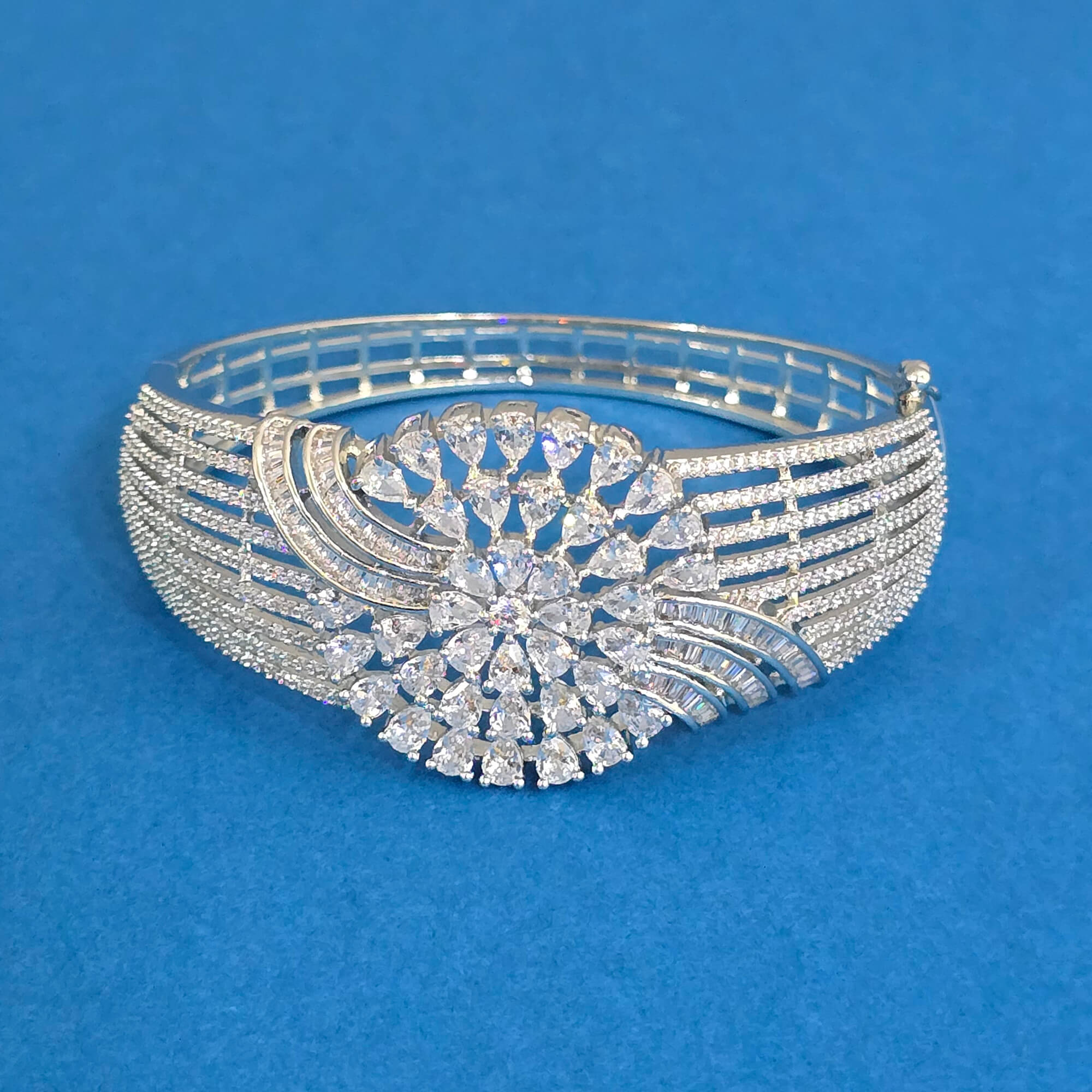 Home / American Diamond Kada / cubic zirconia openable kada with mehndi 2 tone rhodium plating