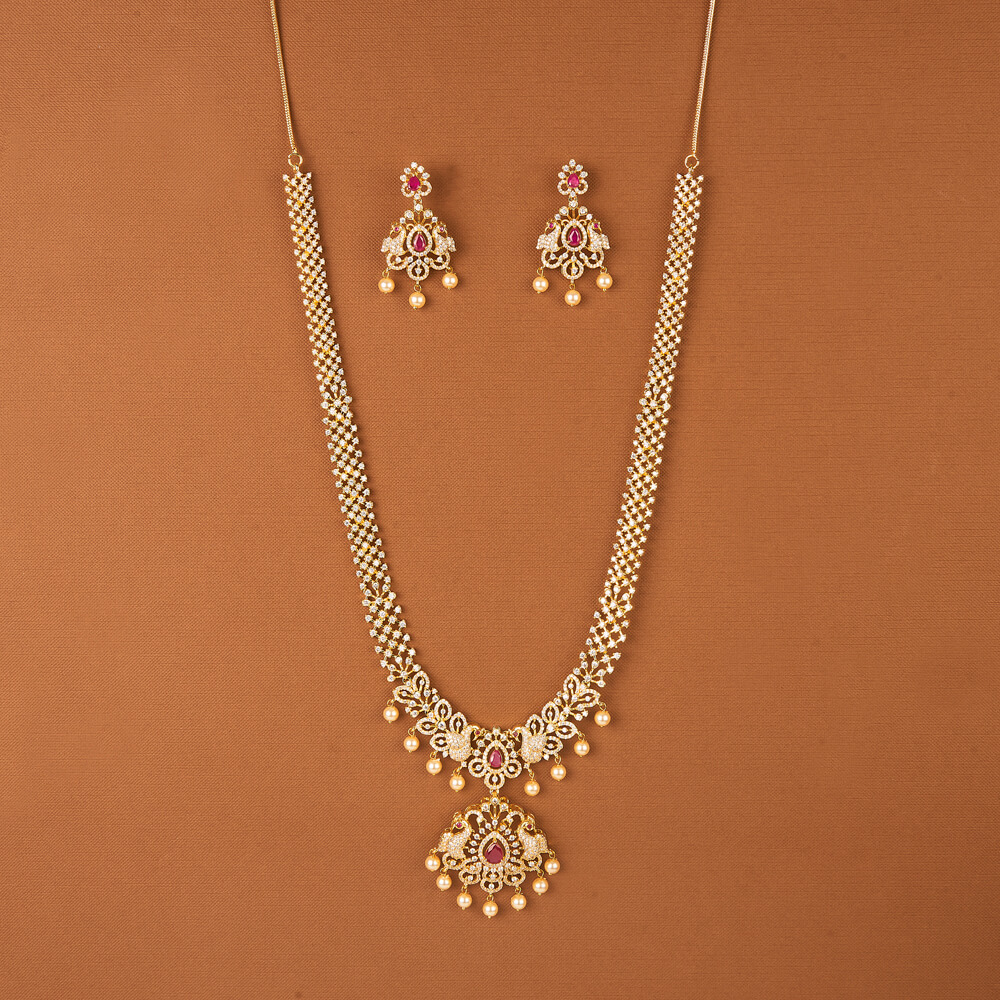 Kanhai Jewels offers an exclusive collection of finest quality crafted Fashion Jewellery in various colors. We make sure that our collection of Cubic Zirconia South Indian Necklace Set With Gold Plating are beautiful, elegent & will surely galvanize you, because our products are unique, comfortable, fashion forward & very popular for the rich look. Base Metal of our product is Alloy, i.e Mixing of Copper & Brass. We pack all the products using quality packaging material to ensure safe and secure transportation.