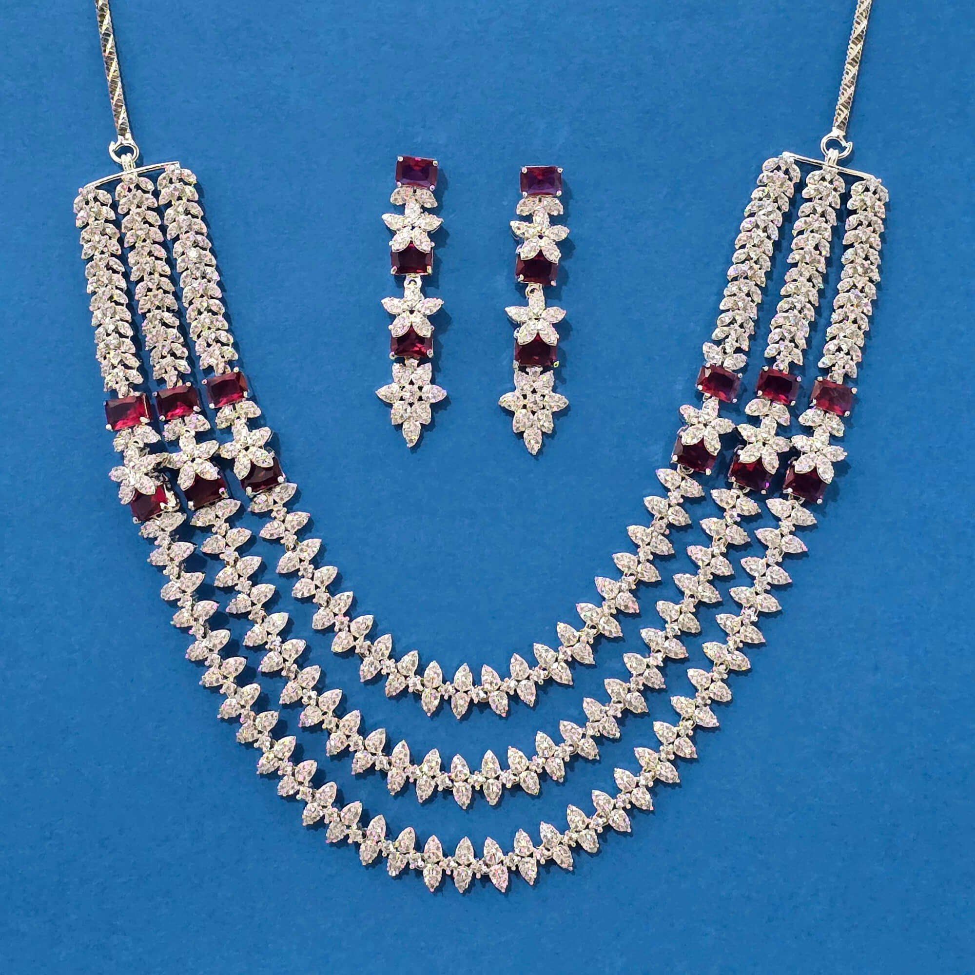 Home / American Diamond Necklace / cz 3 line necklace with rhodium plating