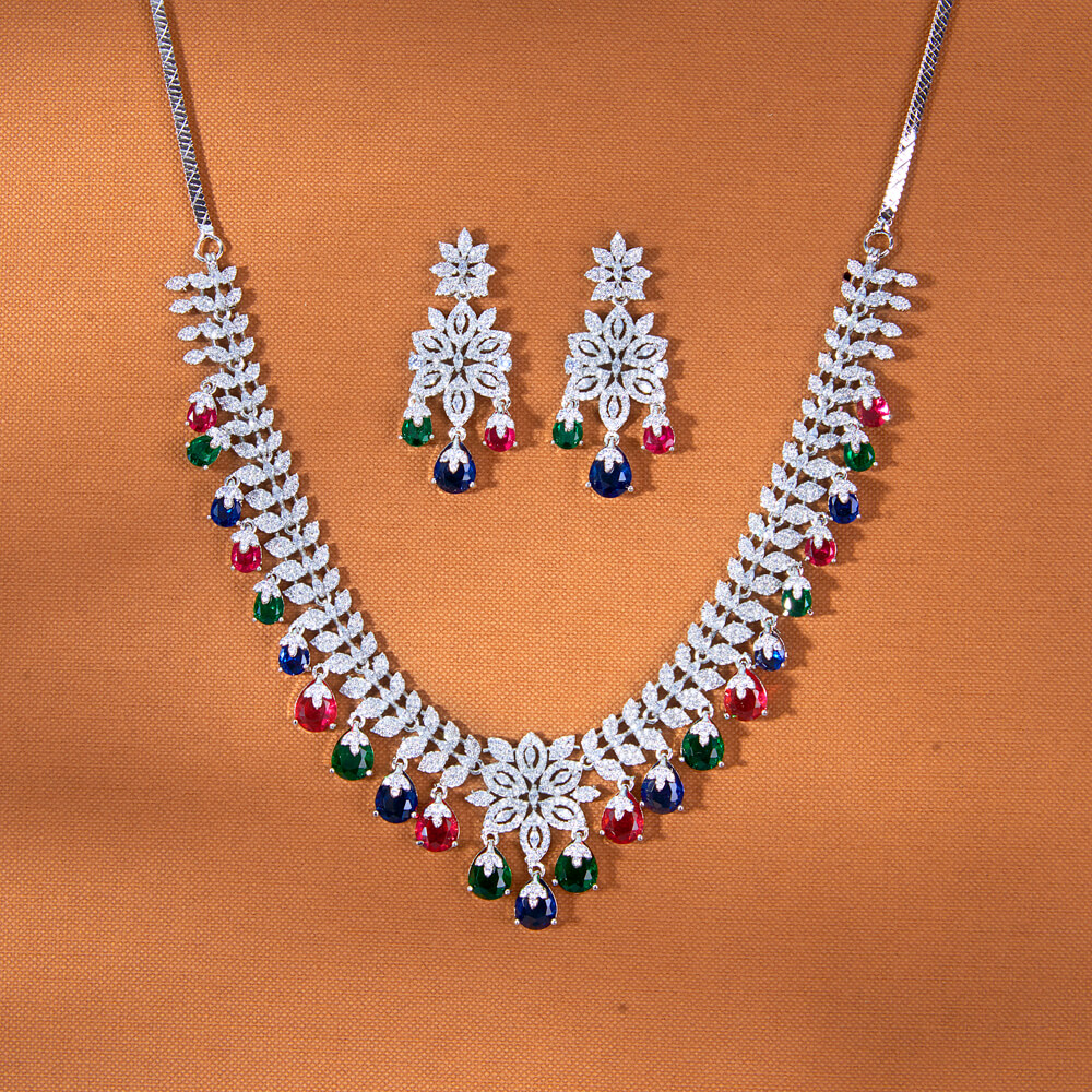 Kanhai Jewels offers an exclusive collection of finest quality crafted Fashion Jewellery in various colors. We make sure that our collection of Cz Classic Necklace With Rhodium Plating Plating are beautiful, elegent & will surely galvanize you, because our products are unique, comfortable, fashion forward & very popular for the rich look. Base Metal of our product is Alloy, i.e Mixing of Copper & Brass. We pack all the products using quality packaging material to ensure safe and secure transportation.