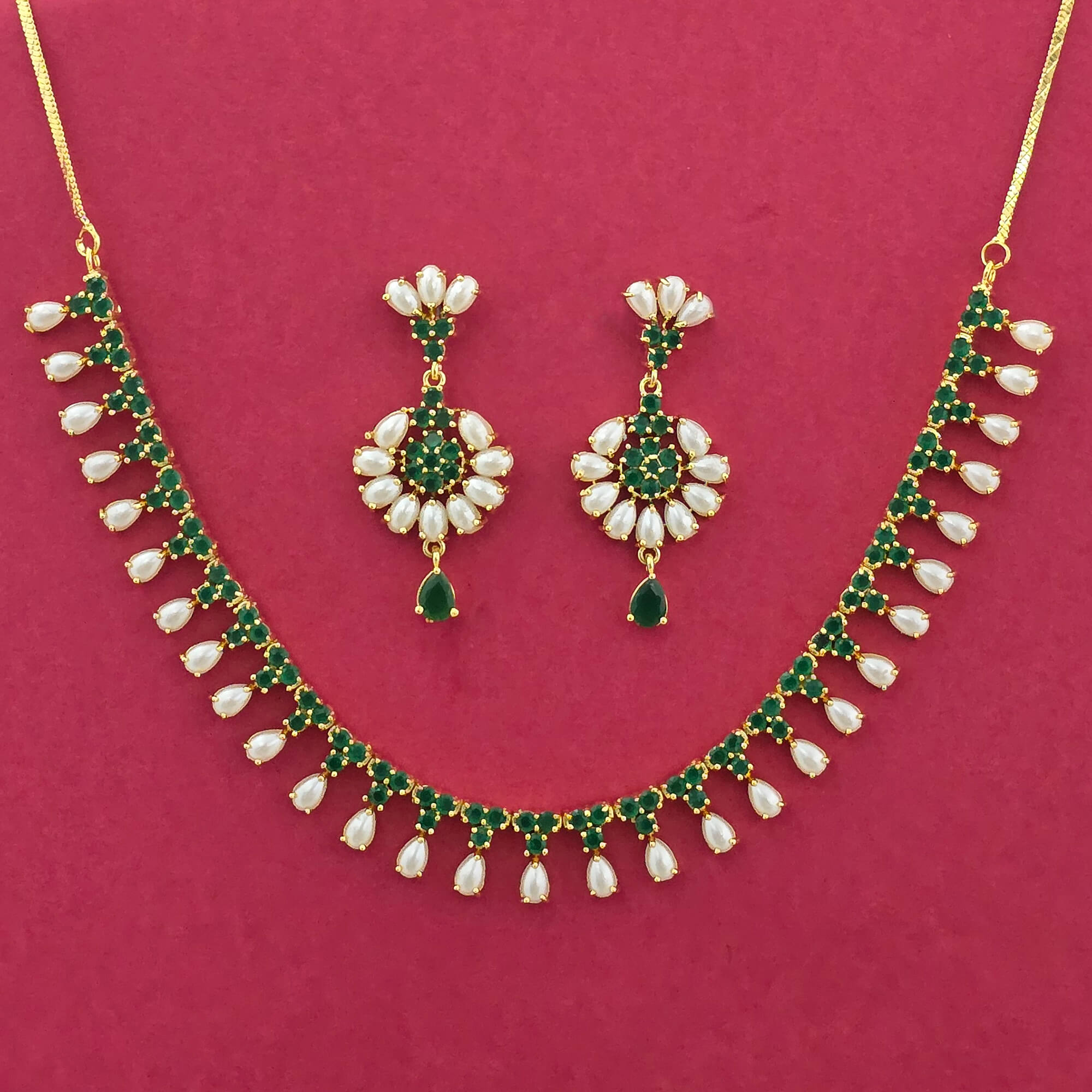 Kanhai Jewels offers an exclusive collection of finest quality crafted Fashion Jewellery in various colors. We make sure that our collection of Cz Moti Necklace Set With Gold Plating are beautiful, elegent & will surely galvanize you, because our products are unique, comfortable, fashion forward & very popular for the rich look. Base Metal of our product is Alloy, i.e Mixing of Copper & Brass. We pack all the products using quality packaging material to ensure safe and secure transportation.