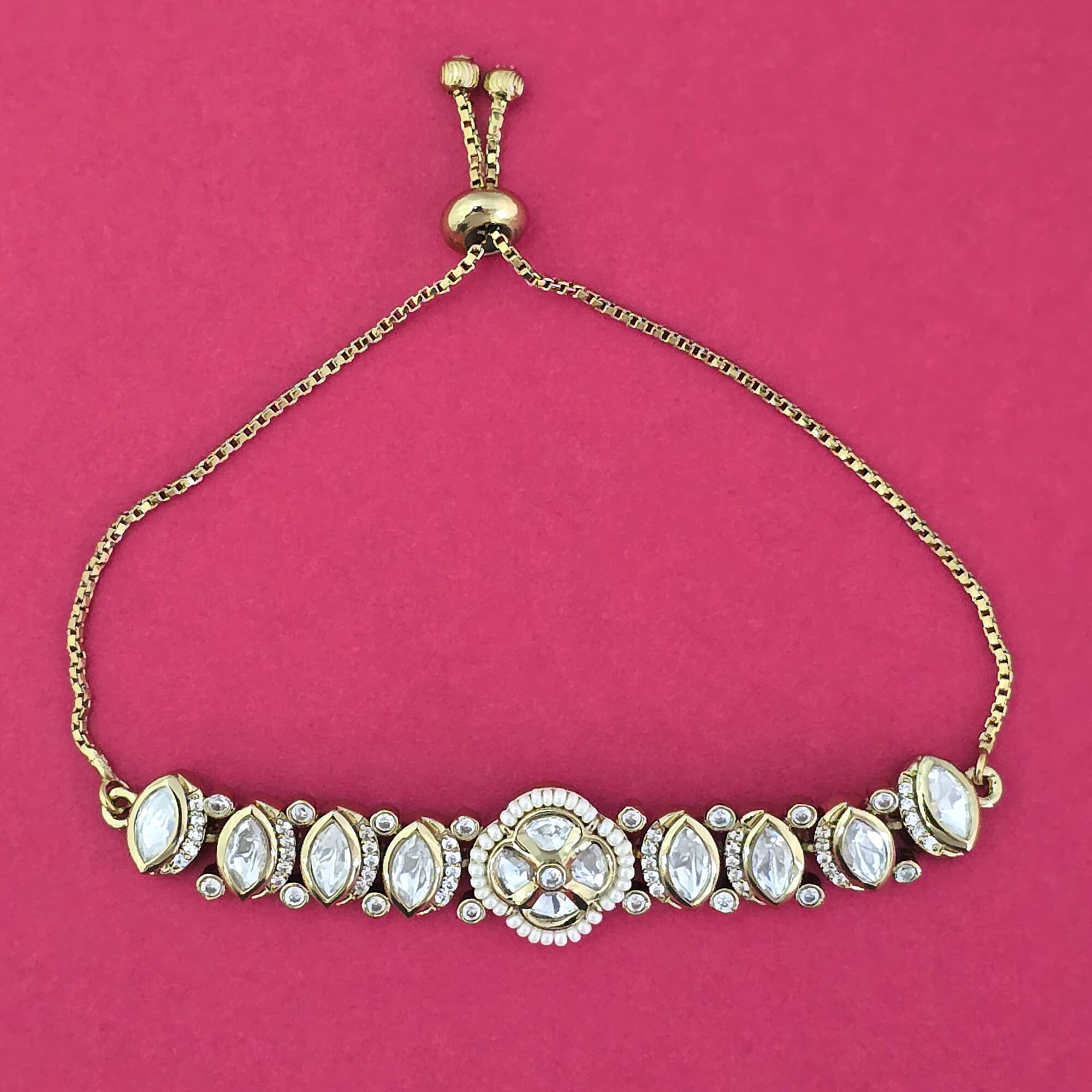 Kanhai Jewels offers an exclusive collection of finest quality crafted Fashion Jewellery in various colors. We make sure that our collection of Kundan Adjustable Bracelet With Mehndi Carat Plating are beautiful, elegent & will surely galvanize you, because our products are unique, comfortable, fashion forward & very popular for the rich look. Base Metal of our product is Alloy, i.e Mixing of Copper & Brass. We pack all the products using quality packaging material to ensure safe and secure transportation.