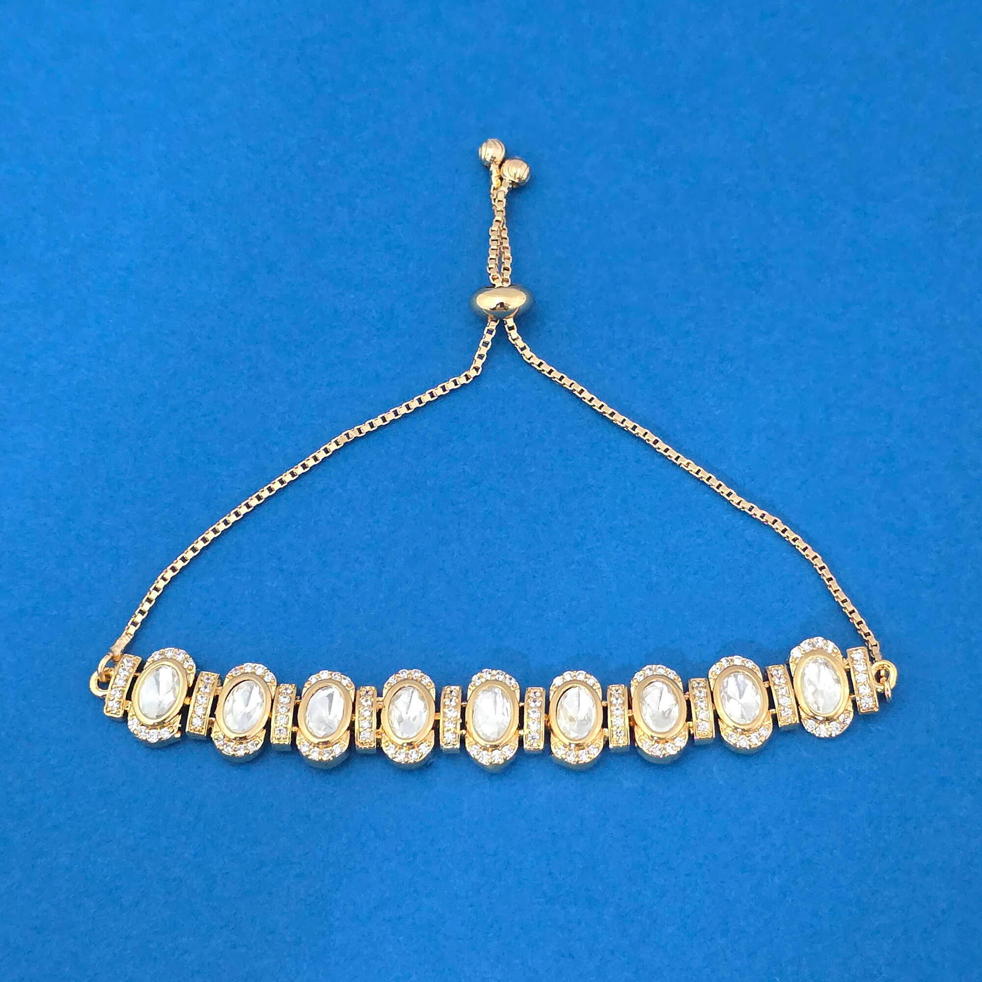 Kanhai Jewels offers an exclusive collection of finest quality crafted Fashion Jewellery in various colors. We make sure that our collection of Kundan Adjustable Bracelet With Mehndi Carat Plating are beautiful, elegent & will surely galvanize you, because our products are unique, comfortable, fashion forward & very popular for the rich look. Base Metal of our product is Alloy, i.e Mixing of Copper & Brass. We pack all the products using quality packaging material to ensure safe and secure transportation.
