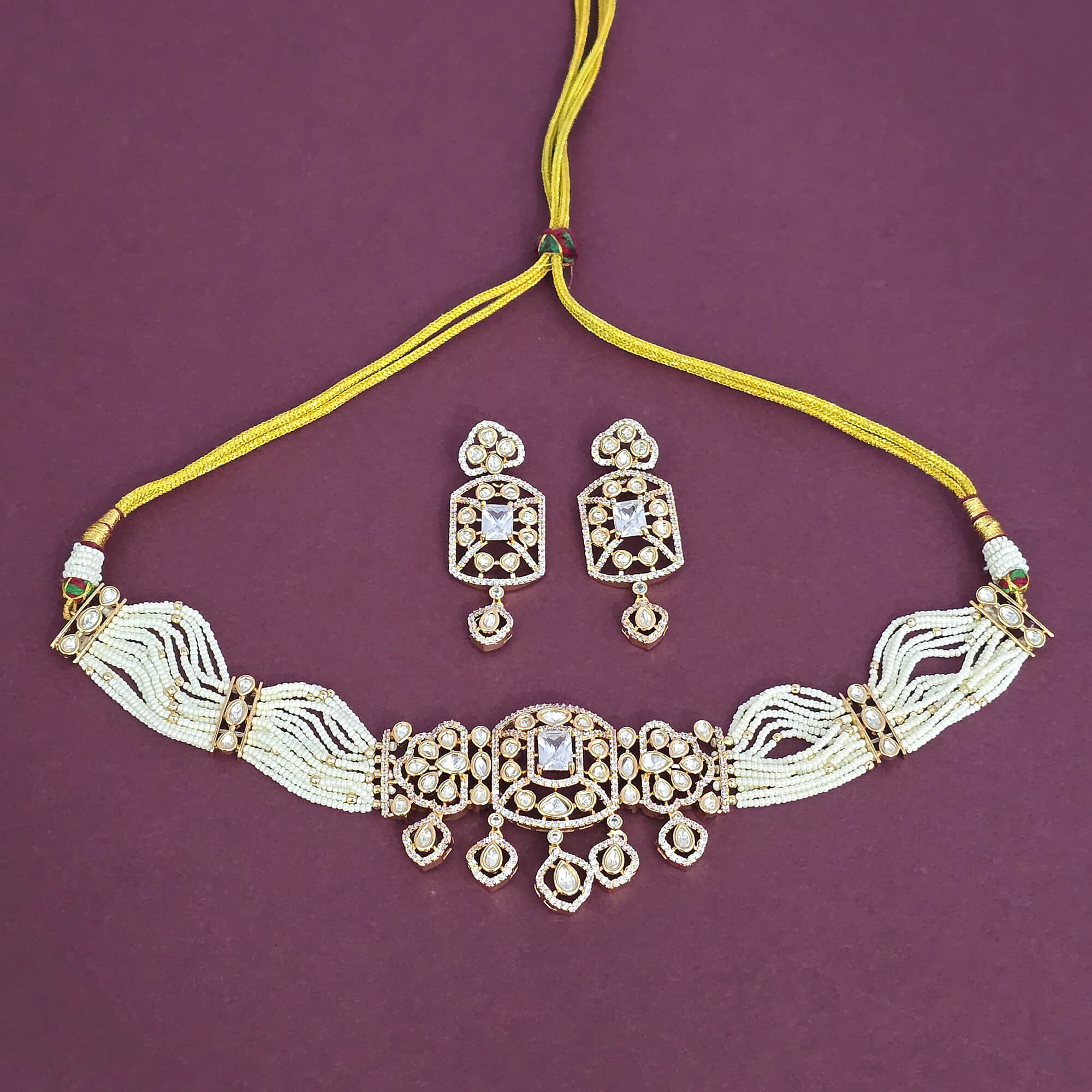 Kanhai Jewels offers an exclusive collection of finest quality crafted Fashion Jewellery in various colors. We make sure that our collection of Kundan Choker Necklace Set With Carat Gold Plating are beautiful, elegent & will surely galvanize you, because our products are unique, comfortable, fashion forward & very popular for the rich look. Base Metal of our product is Alloy, i.e Mixing of Copper & Brass. We pack all the products using quality packaging material to ensure safe and secure transportation.