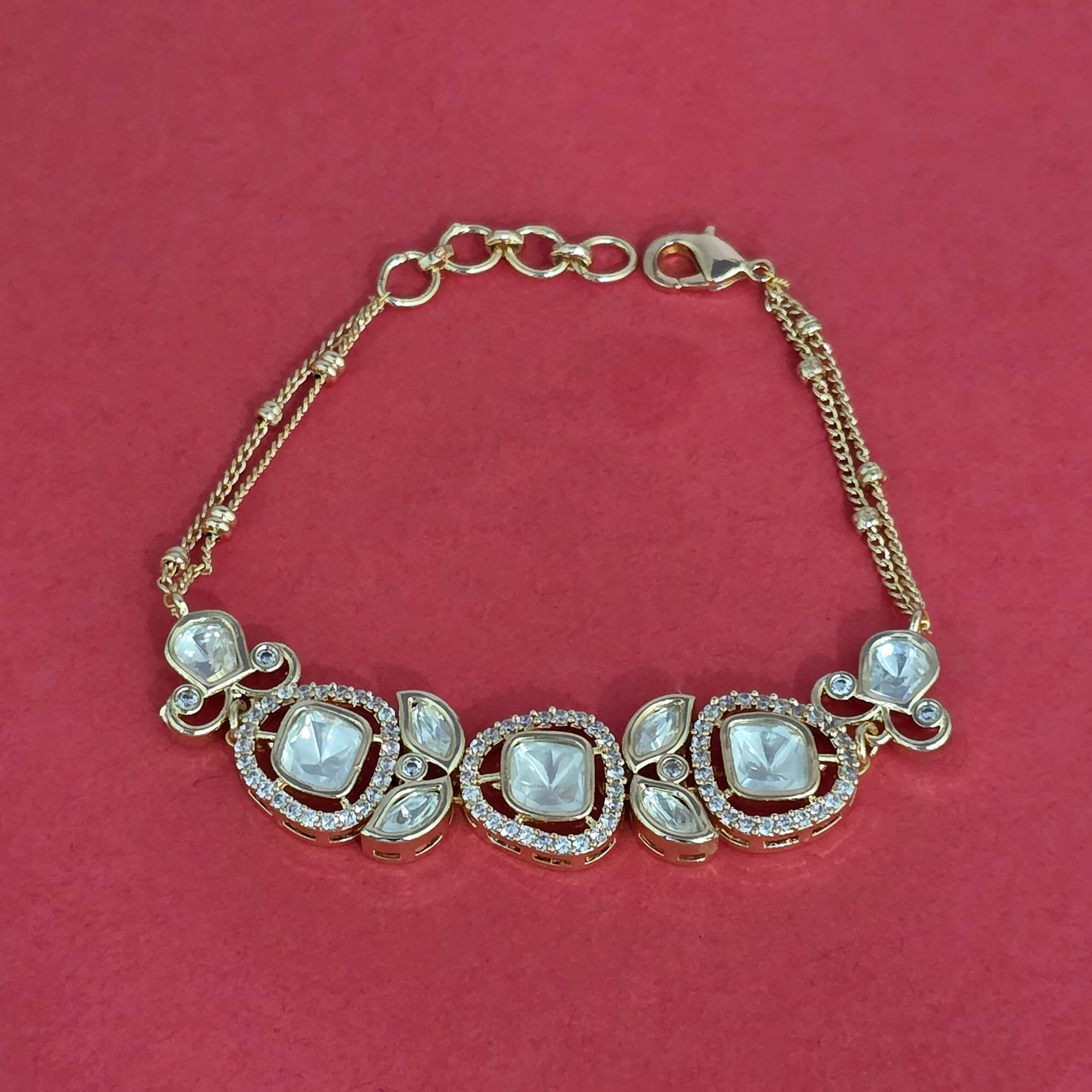 Kanhai Jewels offers an exclusive collection of finest quality crafted Fashion Jewellery in various colors. We make sure that our collection of Kundan Classic Bracelet With Carat Plating are beautiful, elegent & will surely galvanize you, because our products are unique, comfortable, fashion forward & very popular for the rich look. Base Metal of our product is Alloy, i.e Mixing of Copper & Brass. We pack all the products using quality packaging material to ensure safe and secure transportation.